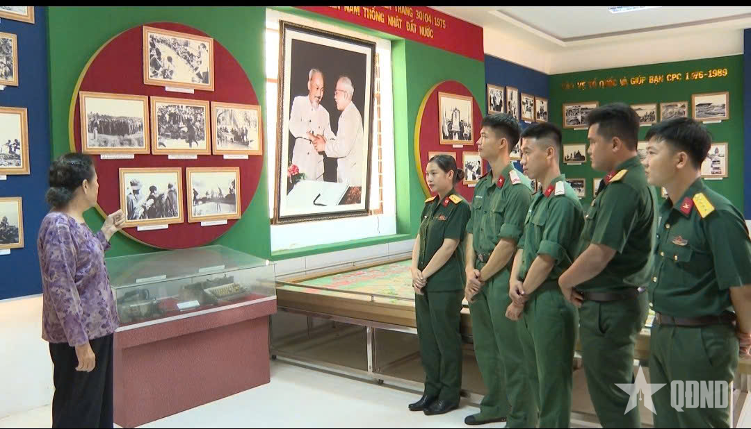 Nữ anh hùng Lưu Nguyệt Hồng và cán bộ, chiến sĩ tại phòng truyền thống Bộ CHQS tỉnh Sóc Trăng (trước đây).