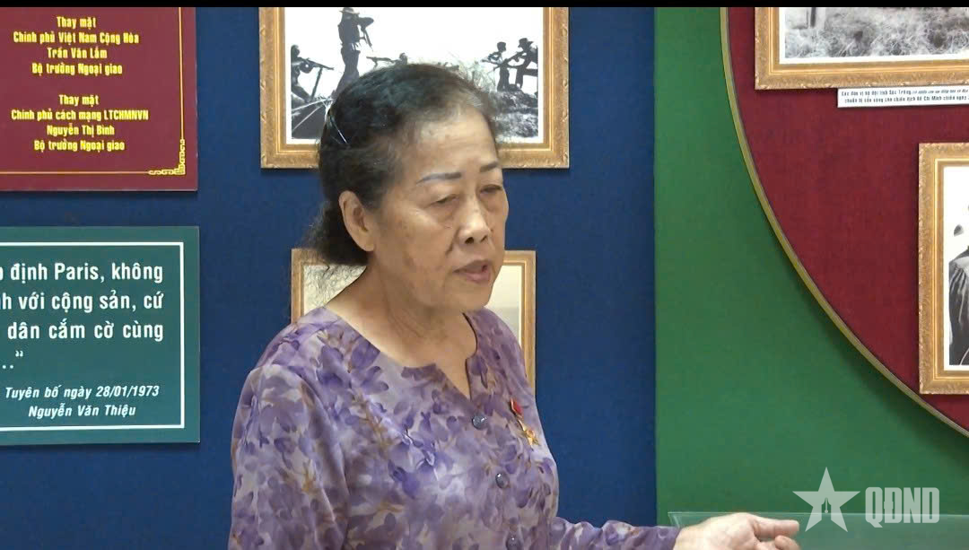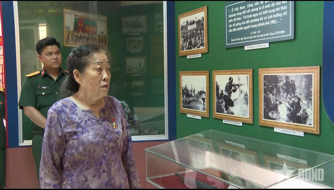 Nữ anh hùng Lưu Nguyệt Hồng xem lại những tư liệu tại phòng truyền thống Bộ CHQS tỉnh Sóc Trăng (trước đây).