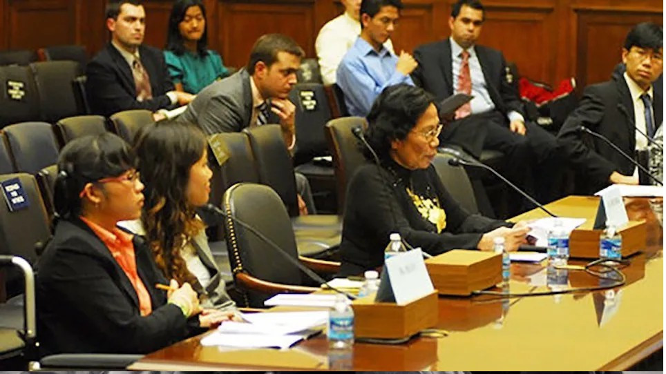 GS.BS Nguyễn Thị Ngọc Phượng (hàng đầu, thứ 3 từ trái sang) tại phiên điều trần trước Hạ viện Mỹ năm 2010. Ảnh: Tư liệu TTXVN.