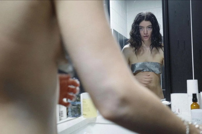 Trong màn trình diễn này, Lorde diện quần jeans đơn giản, nhưng điểm nhấn chính là việc nữ ca sĩ không mặc áo mà chỉ dùng băng dính màu xám để che chắn phần vòng 1. Hình ảnh này thể hiện sự tự tin và cá tính mạnh mẽ của nữ ca sĩ, đồng thời khẳng định tinh thần tự do, nghệ thuật mà cô luôn theo đuổi.