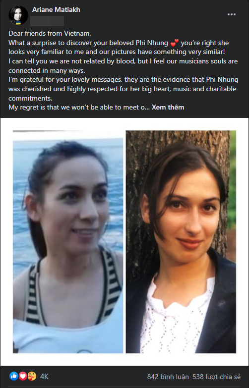 Sau khi thông tin lan truyền, nữ nhạc công Ariane Matiakh (người Ukraine) đã chia sẻ trên trang cá nhân: "Những người bạn Việt Nam kính mến, tôi rất vinh hạnh khi biết đến ca sĩ Phi Nhung. Tôi vô cùng bất ngờ khi phát hiện chúng tôi thật sự có gương mặt giống nhau.