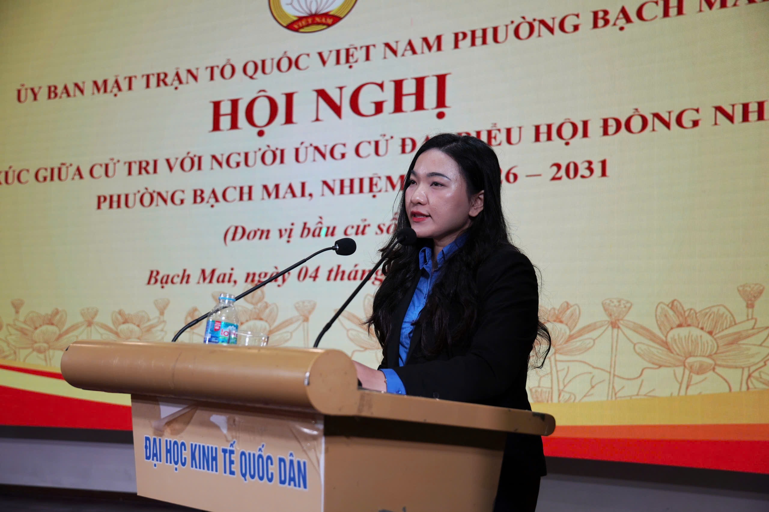 Đồng chí Nguyễn Lê Ngân – Ủy viên BCH Đảng ủy phường, Phó Chủ tịch Thường trực Ủy ban MTTQ Việt Nam phường, Bí thư Đoàn TNCS Hồ Chí Minh phường Bạch Mai chia sẻ về chương trình hành động tại Hội nghị tiếp xúc giữa cử tri với người ứng cử đại biểu HĐND phường Bạch Mai, nhiệm kỳ 2026-2031.