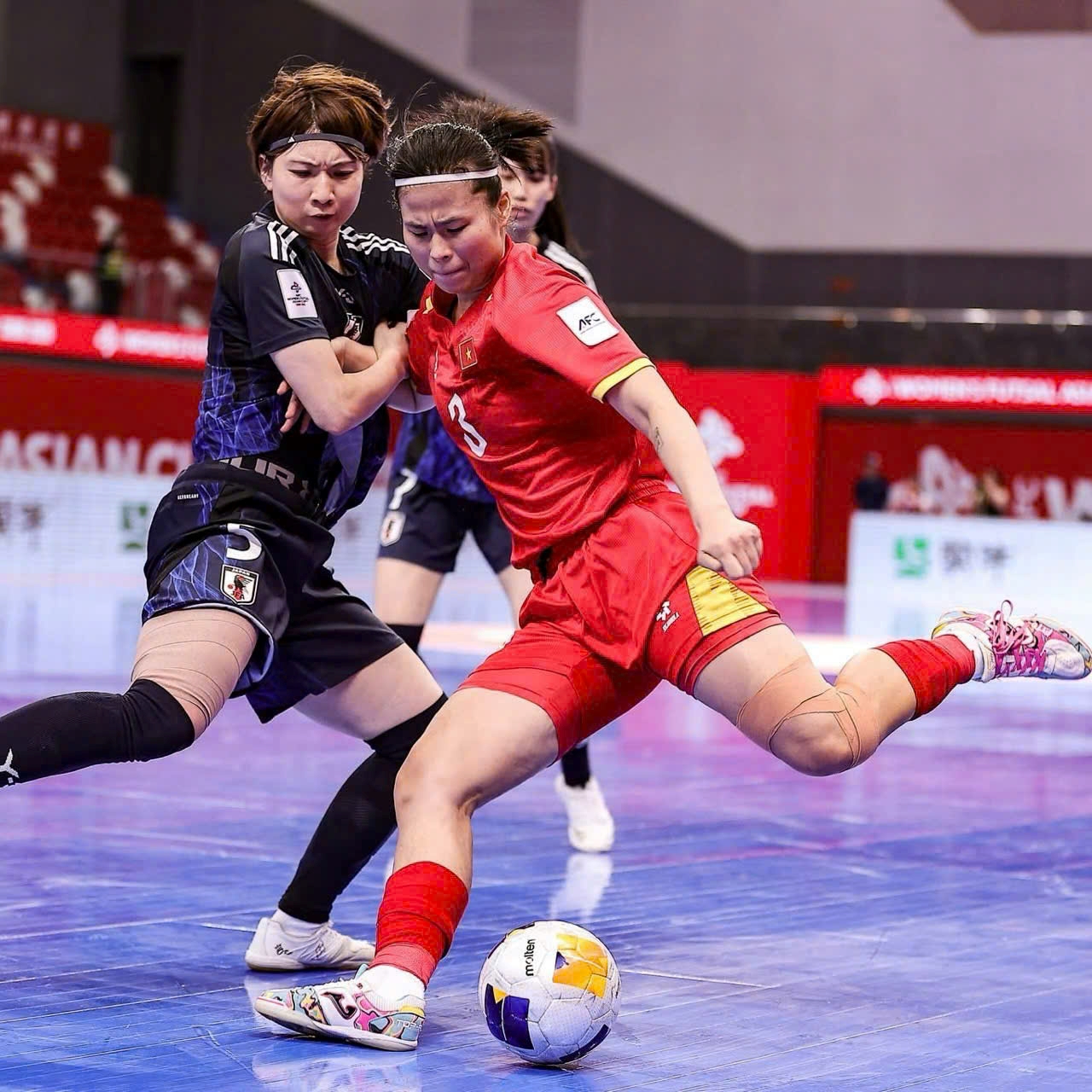 Thu Xuân (áo đỏ) trong 1 pha tranh chấp với cầu thủ Nhật Bản ở trận tứ kết giải Futsal nữ châu Á 2025. Ảnh: NVCC