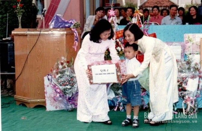 Nhà giáo Ưu tú, Phó Chủ tịch UBND tỉnh Lạng Sơn Nguyễn Thị Yên tặng quà cho Trường Mầm non 19-5 (năm 1999)
