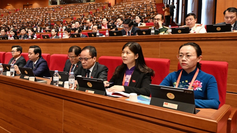 Đại biểu nữ tham dự phiên thảo luận tại hội trường.