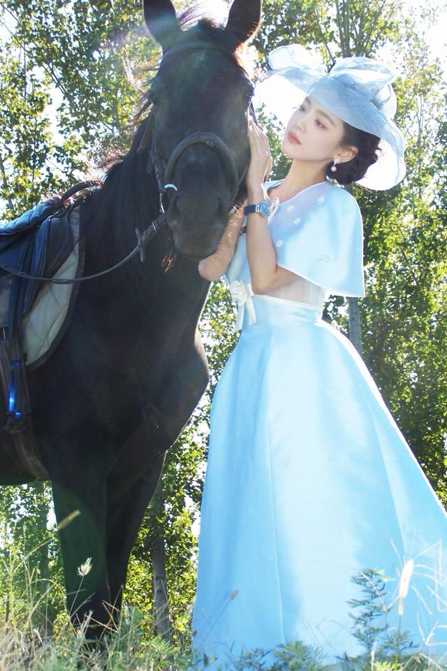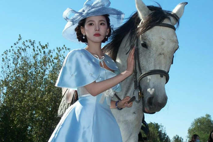 Trong loạt ảnh gây sốt, Chương Nhược Nam diện chiếc váy xanh pastel nhẹ nhàng, điểm xuyết phần cape ngắn thêu hoa tinh tế. Phần eo được nhấn bằng chiếc nơ trắng bản to tạo cảm giác thanh lịch và mềm mại. Hoàn thiện vẻ ngoài là chiếc mũ rộng vành bằng voan trong suốt, giúp cô toát lên thần thái tiểu thư đài các như bước ra từ những trang tiểu thuyết lãng mạn. Cô nhẹ nhàng sánh bước bên cạnh chú ngựa trắng và đen, khung cảnh đồng cỏ, trời xanh nắng vàng tạo nên bức tranh đậm chất thơ.