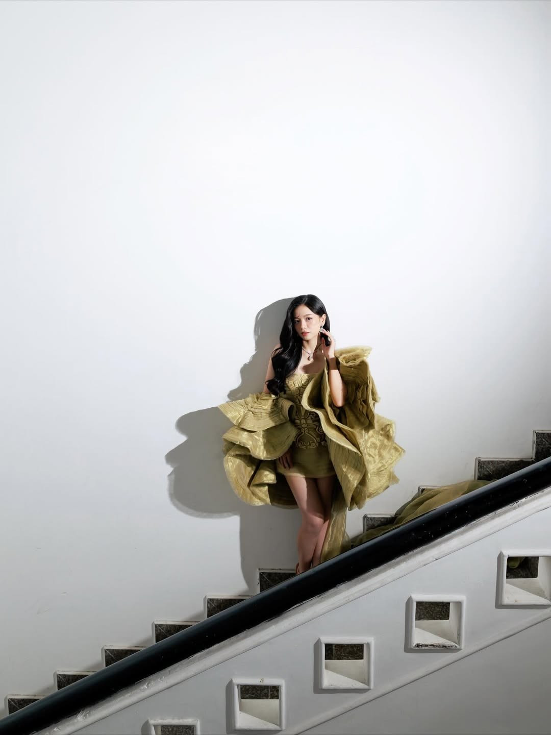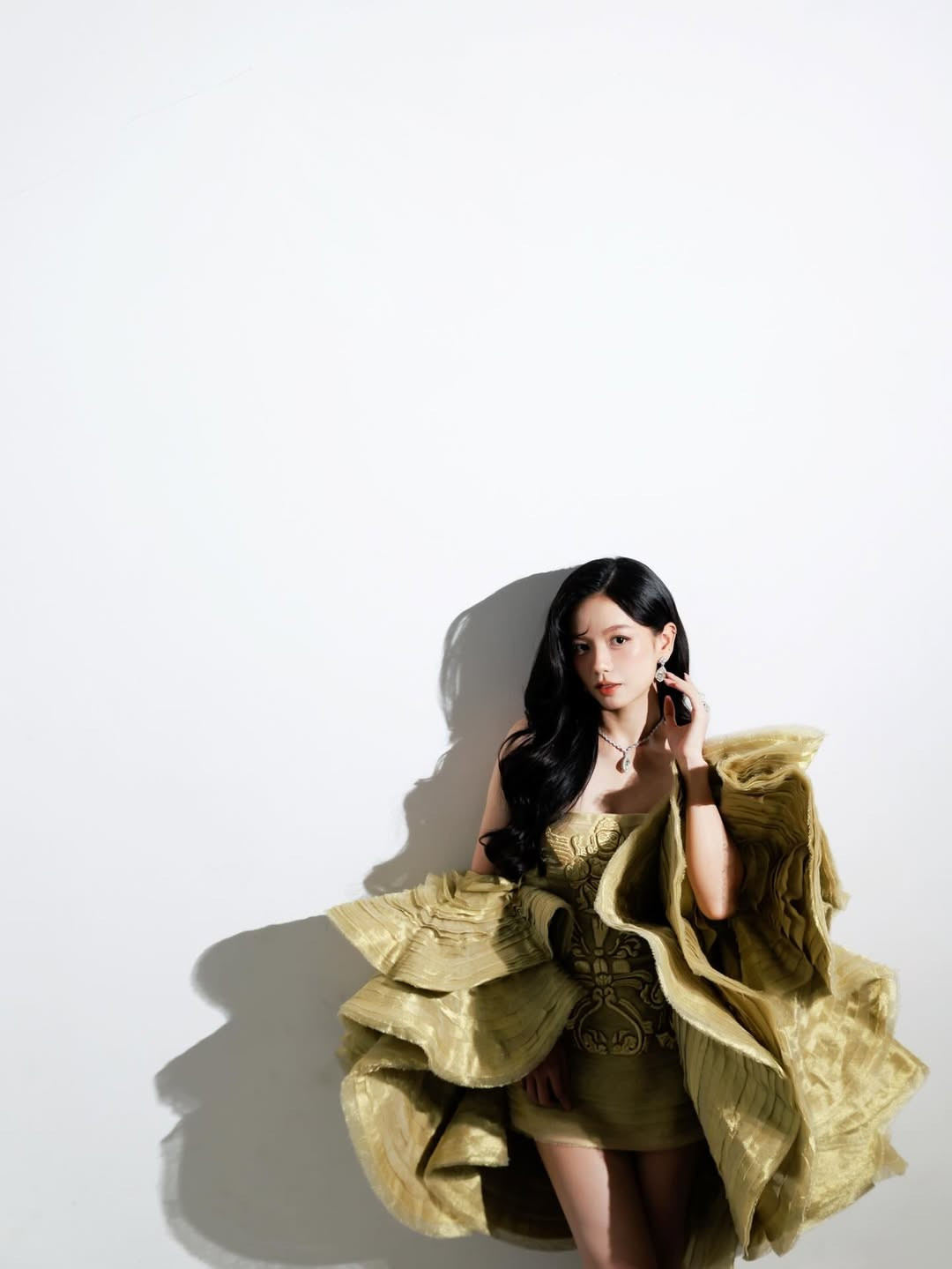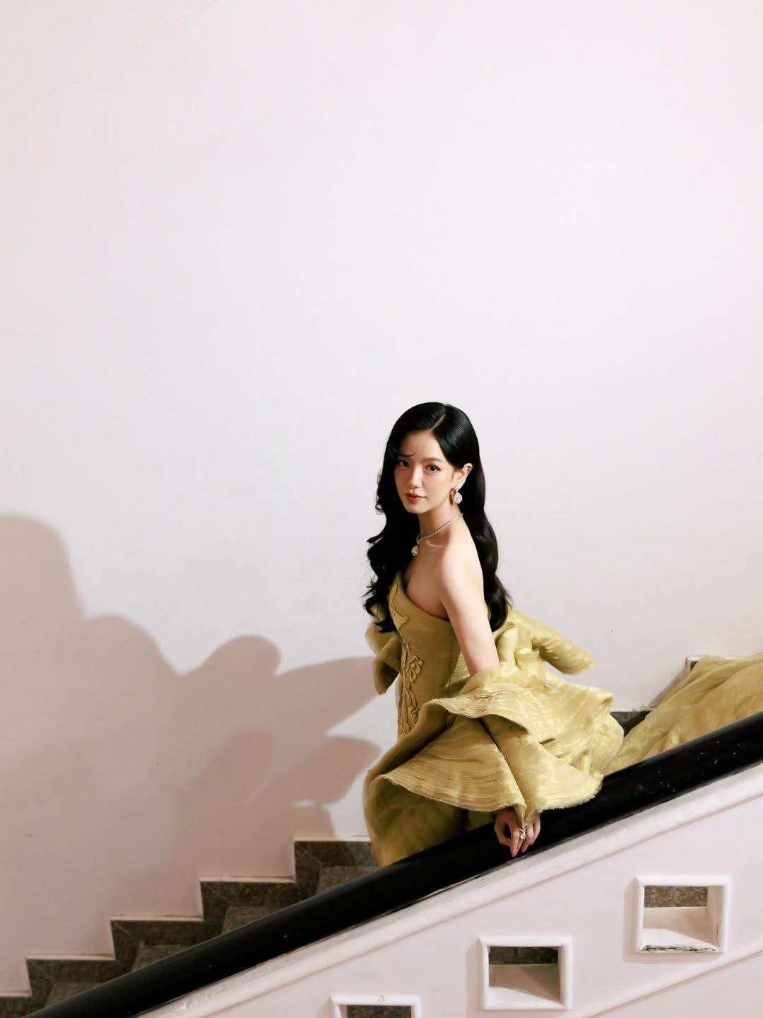 Tổng thể làm nổi bật hình ảnh một nữ diễn viên trẻ nhưng có phong thái trưởng thành, sang trọng và cuốn hút.