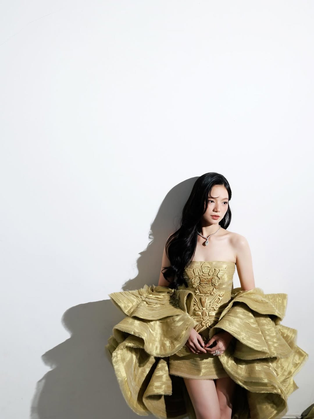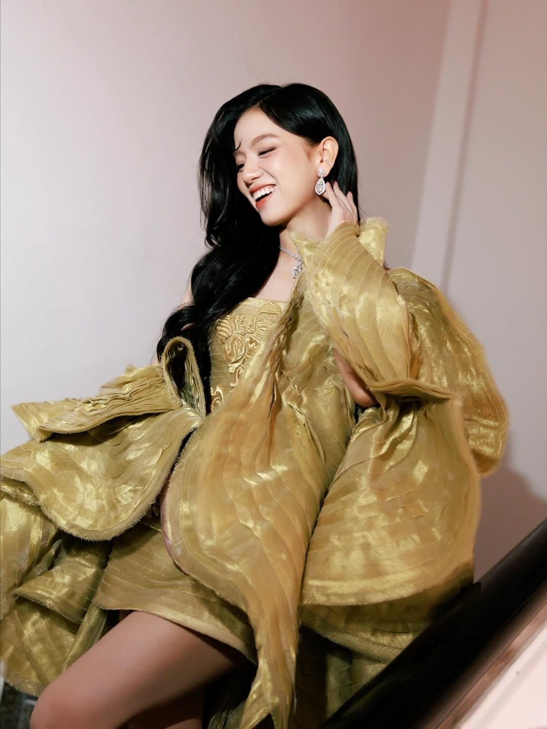 Bộ trang phục được Hạ Anh lựa chọn có thiết kế cầu kỳ và hoàn toàn nổi bật. Đầm vàng ánh kim với họa tiết thêu nổi tinh xảo, tạo điểm nhấn hoàng gia. Phần tay áo phồng xếp lớp mang lại cảm giác lộng lẫy như bước ra từ một buổi dạ hội.