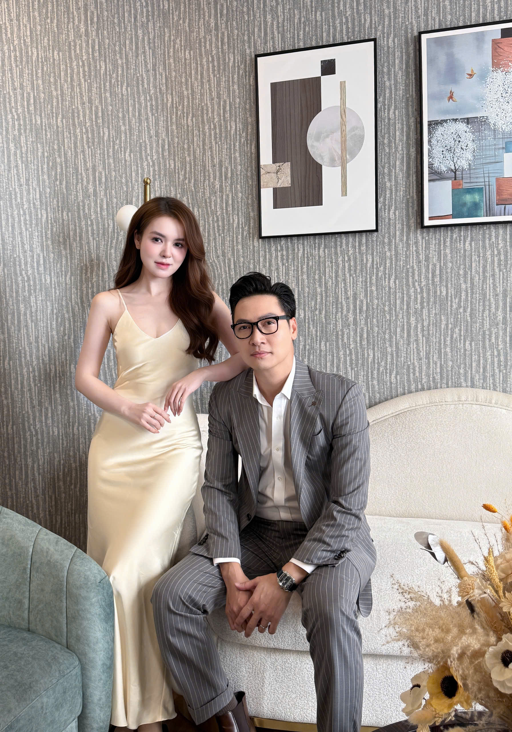 Bích Ngọc và Mạnh Trường ở hậu trường phim. Cô chia sẻ với VietNamNet: "Có những cảnh tình cảm với anh Mạnh Trường, tôi cũng hơi ngại và hơi cuống nhưng tính cách anh ấy bên ngoài vui vẻ và hòa đồng nên cũng đỡ run hơn".