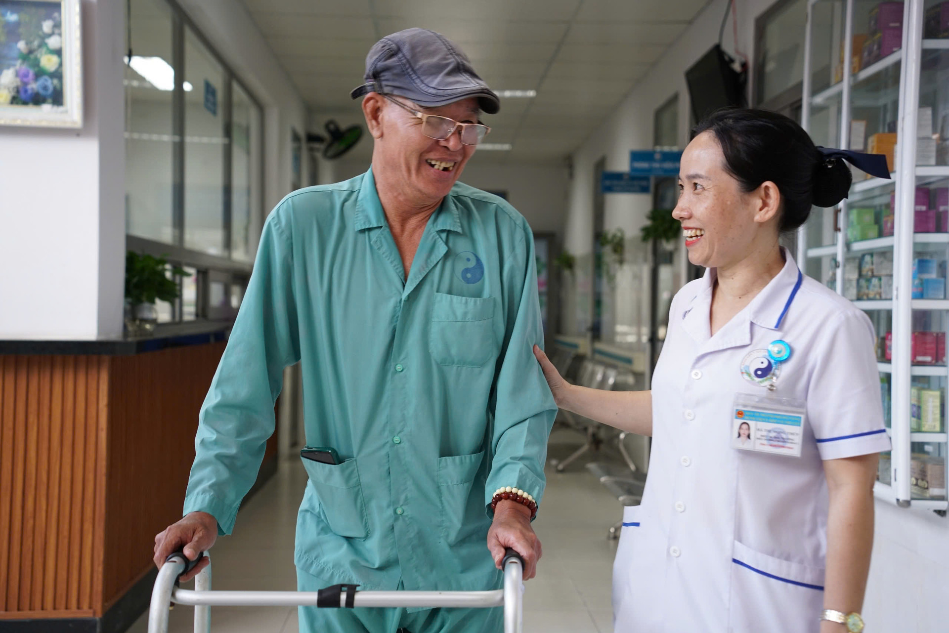 Ông Nguyễn Văn Thuận (bệnh nhân nội trú) được chị Thúy kiên nhẫn dìu từng bước đi, vừa kiểm tra các chỉ định trong ngày và hướng dẫn cụ thể. Ông Thuận cho biết đã nhiều lần khám, điều trị tại bệnh viện và luôn ấn tượng với sự ân cần của các điều dưỡng, đặc biệt là chị Thúy.