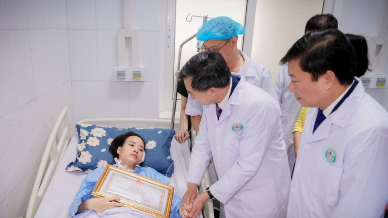 Thứ trưởng Y tế Trần Văn Thuấn trao Bằng khen của Bộ trưởng Y tế cho điều dưỡng Nguyễn Thị Thùy Trang.
