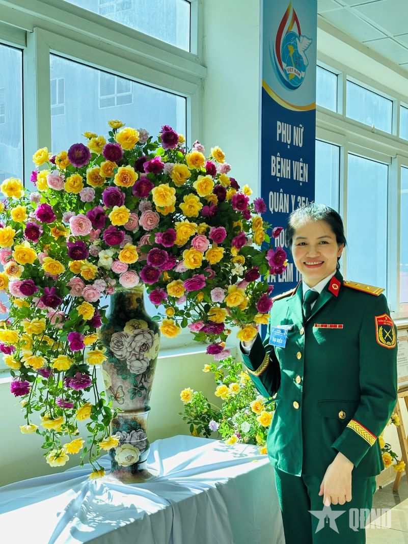 Trung tá QNCN Lê Lam Hà bên bình hoa do chị cắm chào mừng Đại hội đại biểu Hội Phụ nữ Bệnh viện Quân y 354 (tháng 10-2025).