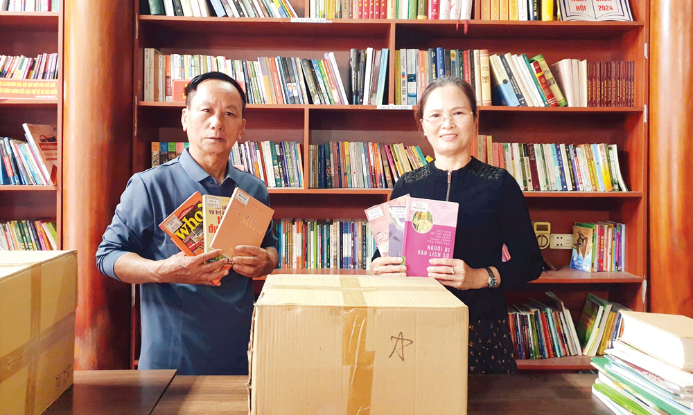 Chị Cao Thảo Nguyên tặng sách cho một tủ sách dòng họ tại thôn Đông Thái, xã Yên Phong.