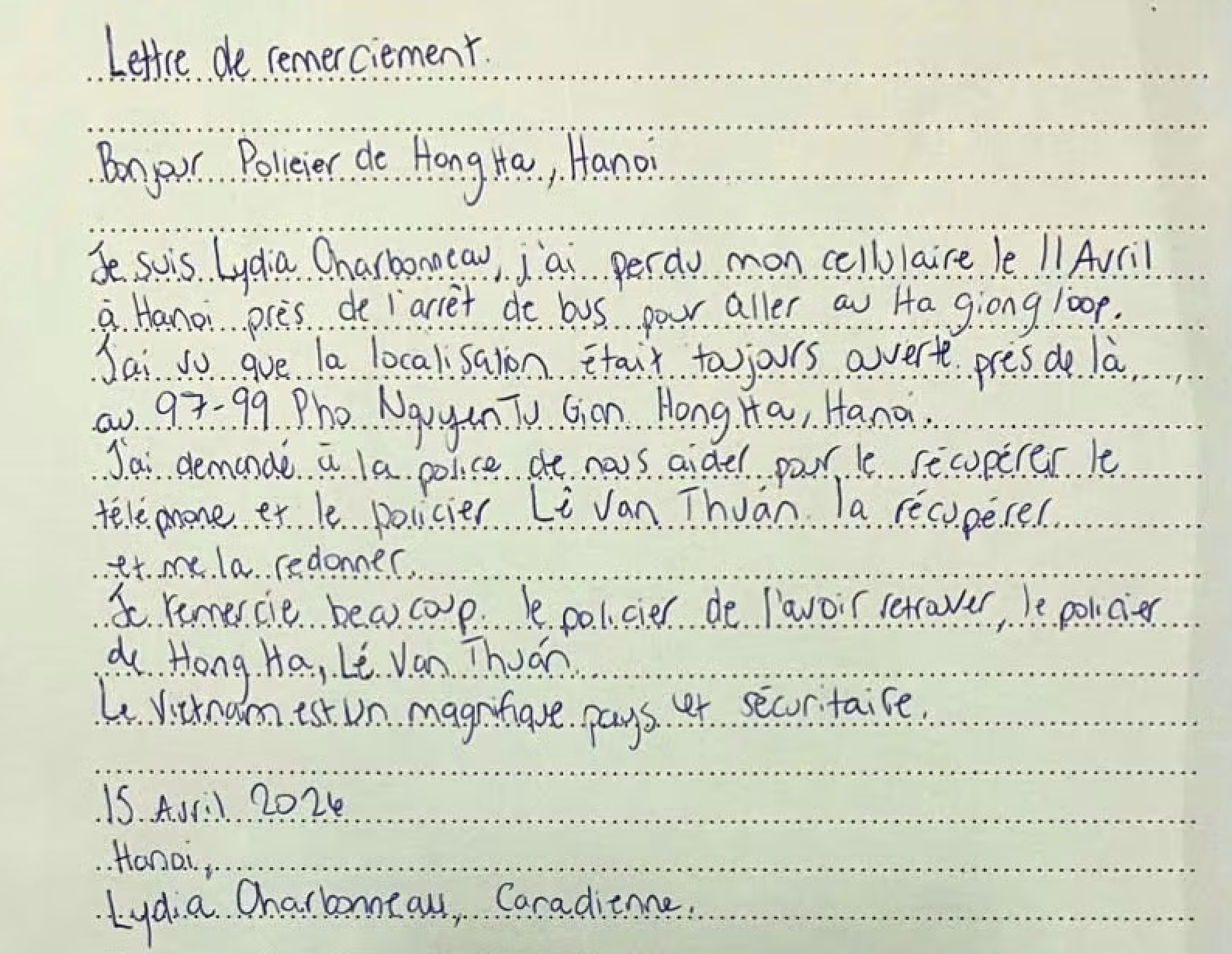 Để bày tỏ lòng biết ơn, ngay tại trụ sở, chị Lydia đã viết tay một bức thư cảm ơn bằng tiếng Pháp gửi tới lực lượng Công an phường Hồng Hà và Đại úy Lê Văn Thuần.