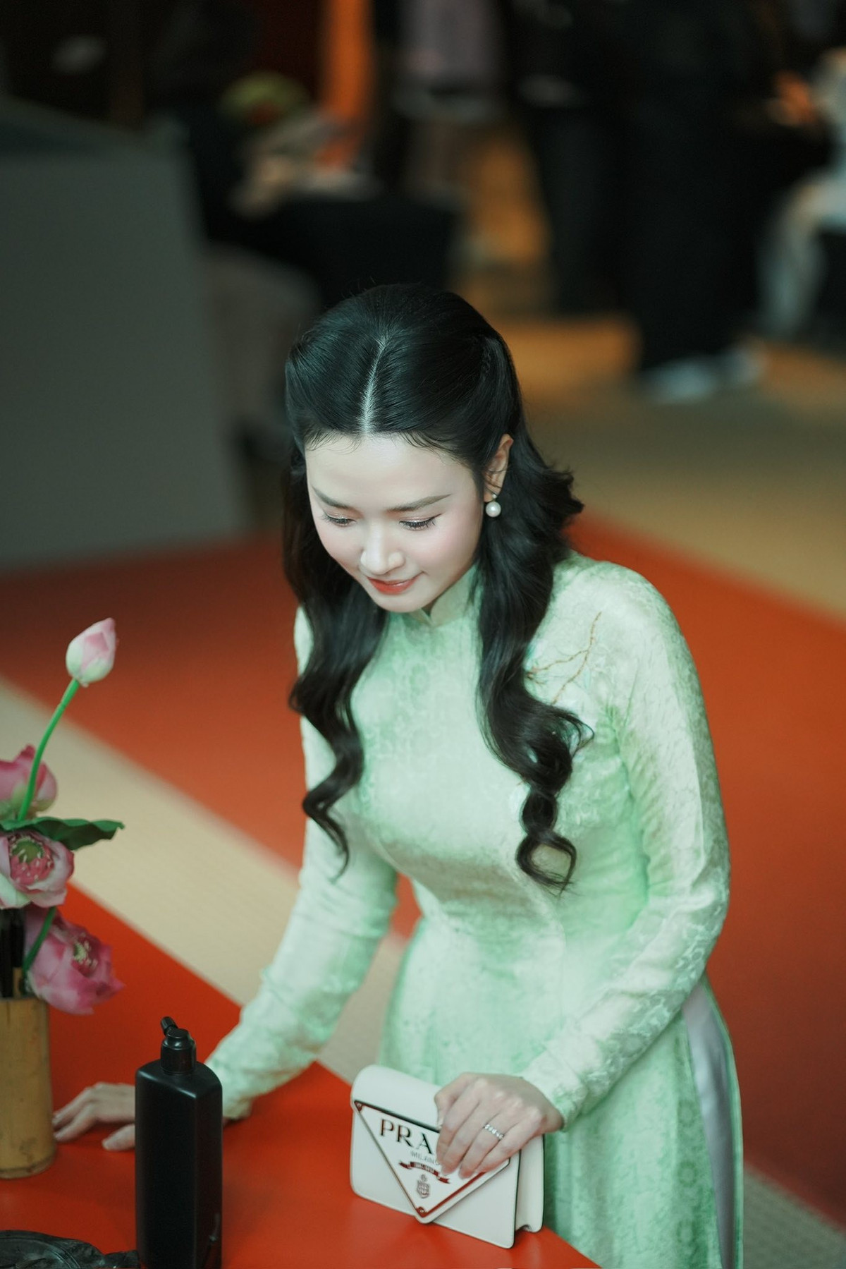 Qua loạt ảnh được chia sẻ, Midu xuất hiện trong chiếc áo dài màu tím nhạt với họa tiết hoa văn dệt tinh tế. Chất liệu lụa mềm rủ nhẹ, tạo nên vẻ đẹp vừa nền nã vừa sang trọng.