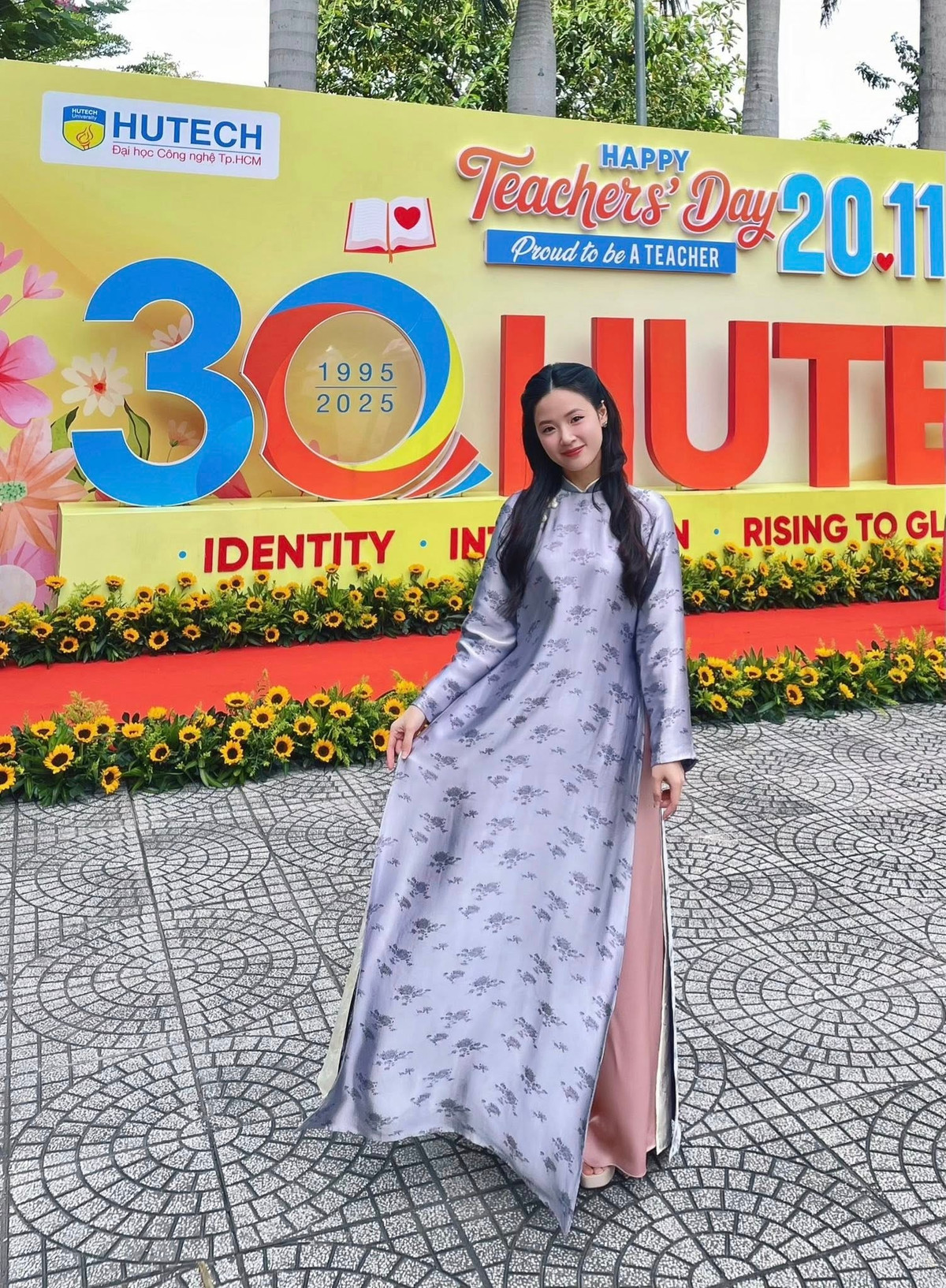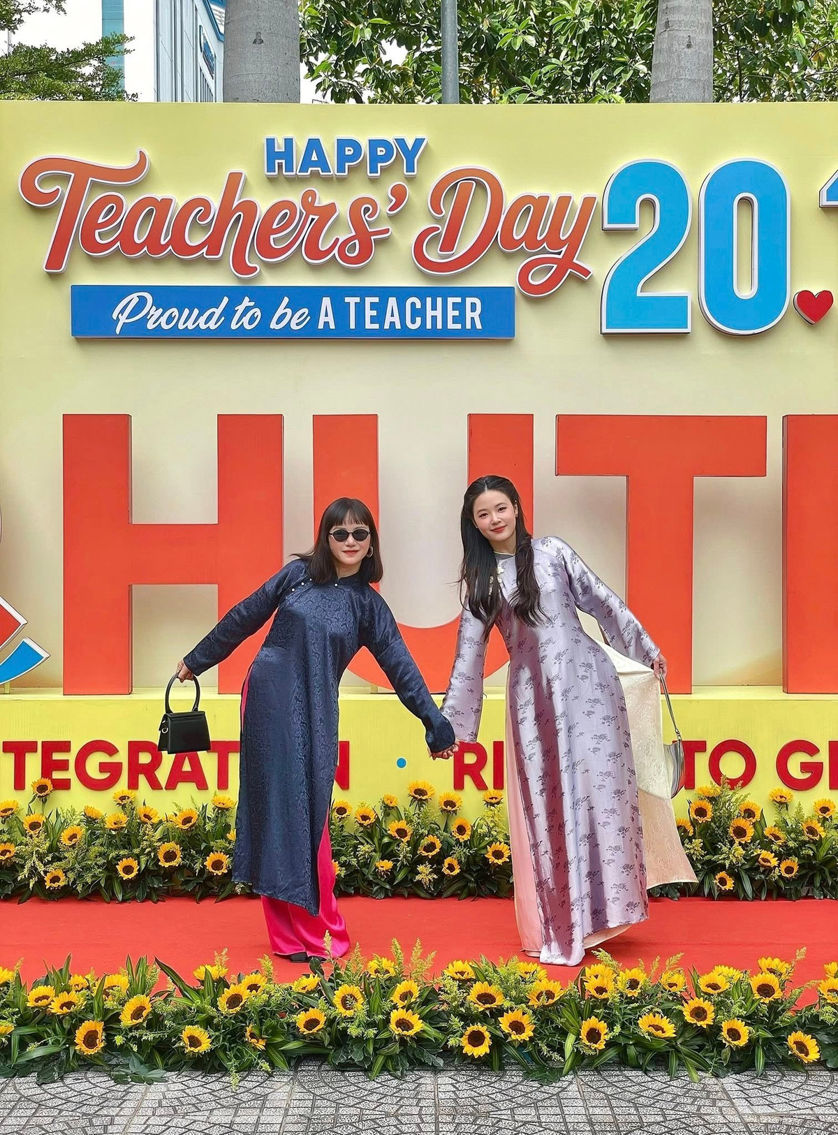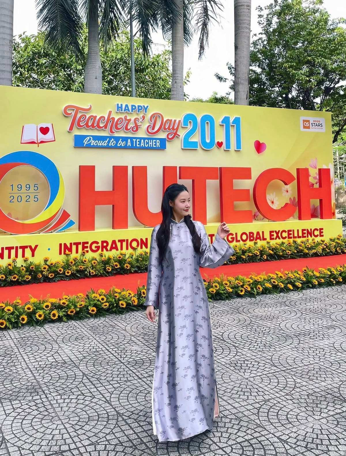 Giữa không gian rực rỡ hoa hướng dương và backdrop chúc mừng Ngày Nhà giáo Việt Nam của HUTECH, hình ảnh Midu như hòa vào sắc lễ hội – trang trọng nhưng gần gũi, hiện đại nhưng vẫn giữ được tinh thần truyền thống của áo dài Việt.