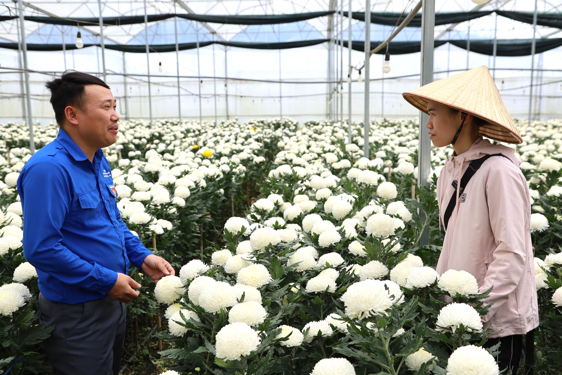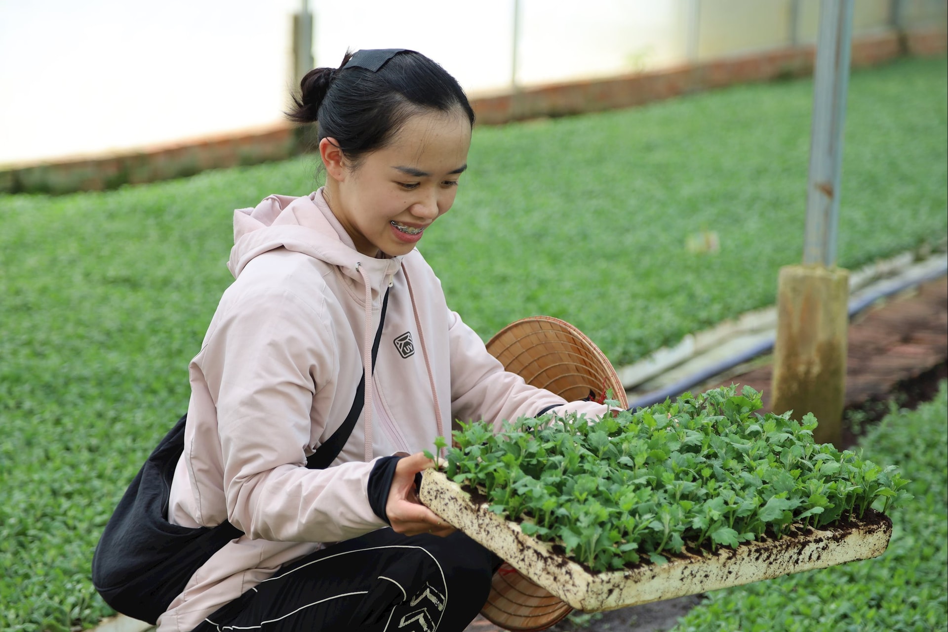 Sáng sớm khi sương vẫn còn phủ mờ trên triền đồi, những dãy nhà kính công nghệ cao hiện lên như những khối pha lê giữa đồi xanh. Bên trong, hàng ngàn cây cúc mẫu đơn đang khoe sắc đầy sức sống, trắng muốt cả không gian. Giữa khu vườn ấy là cô gái trẻ Nguyễn Thị Bảo Nhi (SN 2001) đang miệt mài kiểm tra từng vòi phun sương, từng cảm biến nhiệt độ, tỉ mỉ xem xét từng nhành hoa như chăm những đứa con tinh thần của mình.