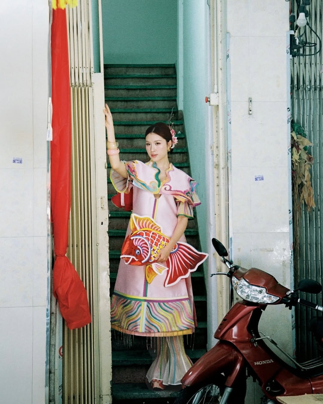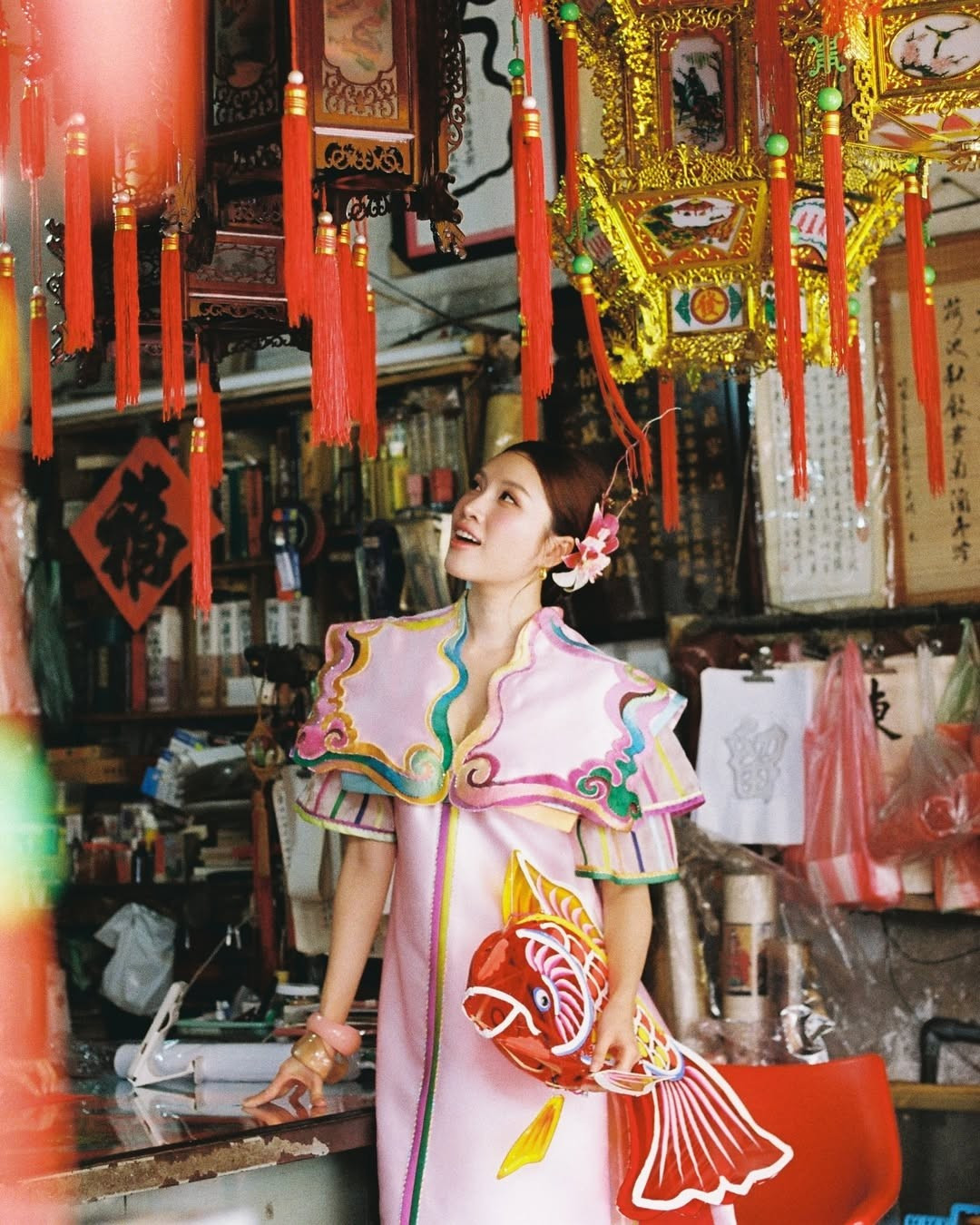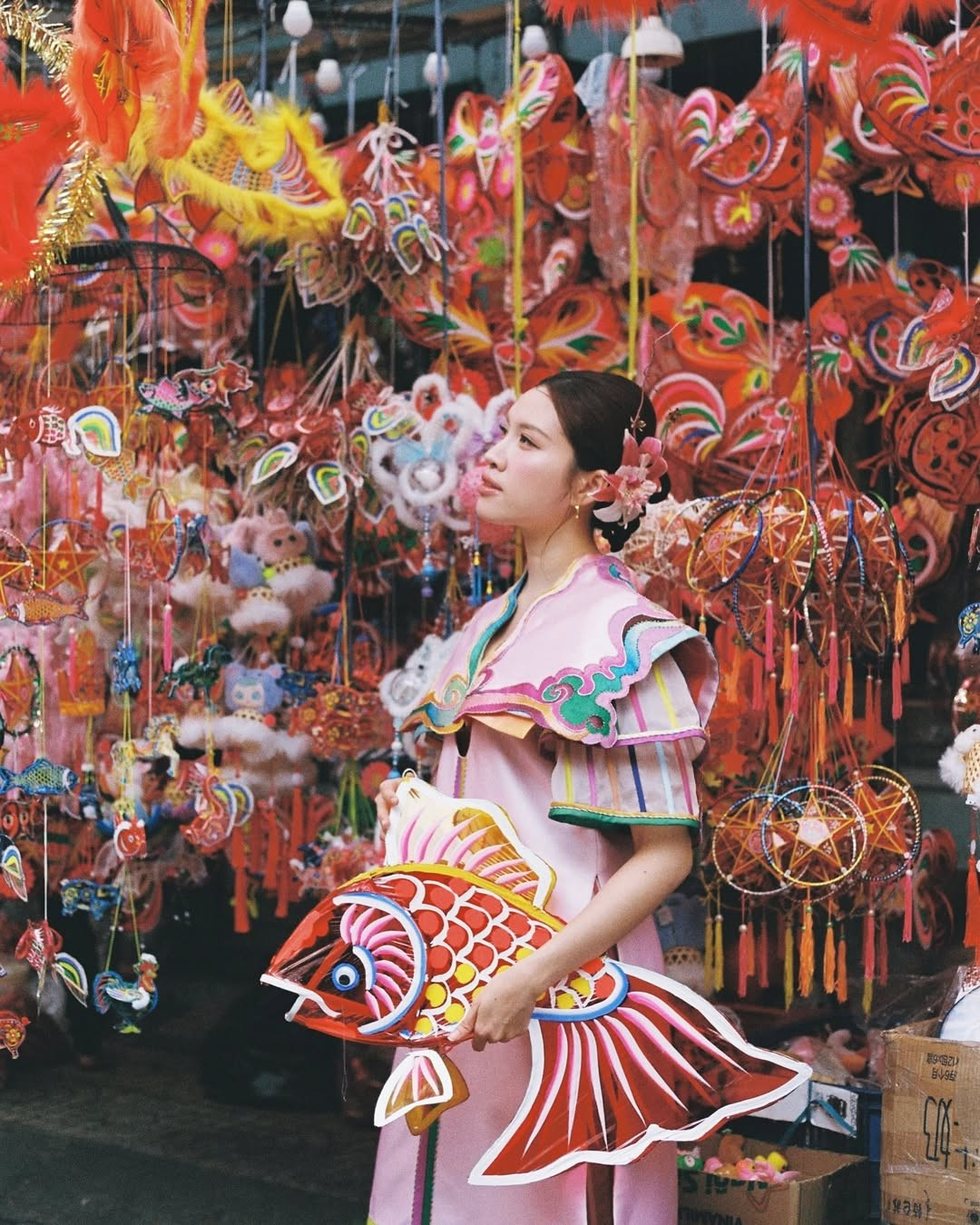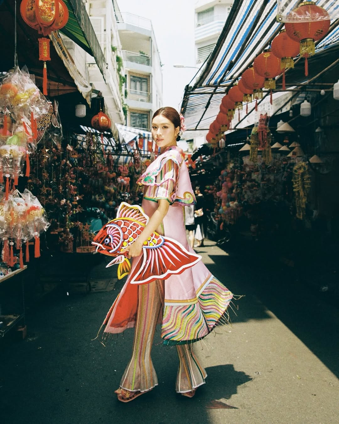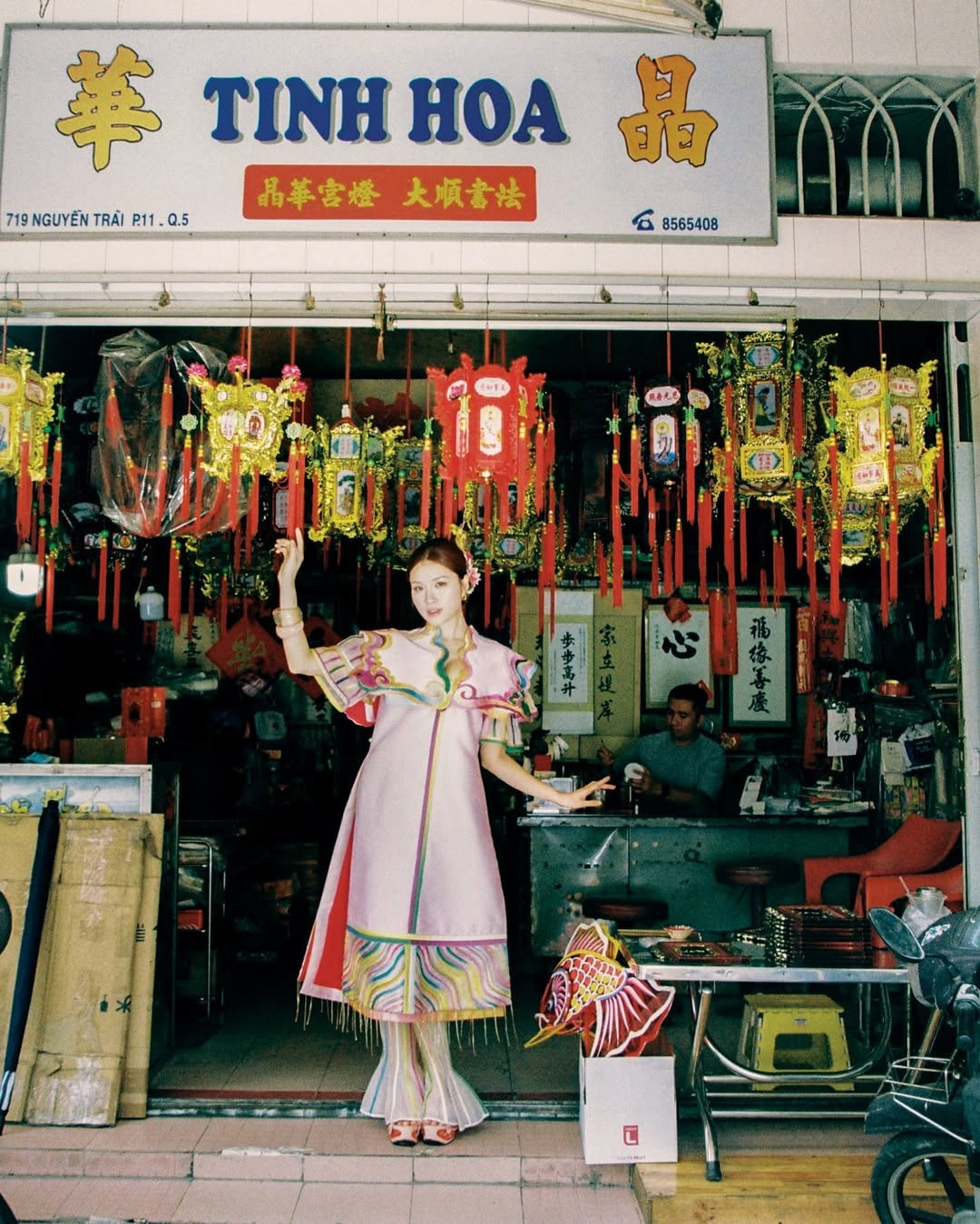 Trong bộ ảnh, Thanh Thanh Huyền xuất hiện với trang phục áo dài cách tân hoặc những bộ cánh nhẹ nhàng, tinh tế, phù hợp với không gian cổ kính, rực rỡ sắc màu của khu phố người Hoa.