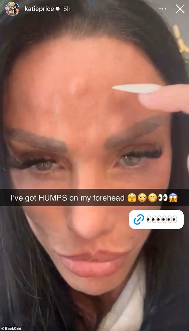 Trong đoạn video, Katie Price quay cận cảnh phần trán lồi lõm bất thường, kèm dòng chú thích: “Tôi có những cục u trên trán mình”. Hình ảnh của nữ người mẫu nhanh chóng được chia sẻ lại trên nhiều diễn đàn, thu hút sự chú ý của cộng đồng mạng. Nhiều khán giả bày tỏ lo lắng, cho rằng tình trạng của cô có thể là dấu hiệu biến chứng sau thủ thuật thẩm mỹ.