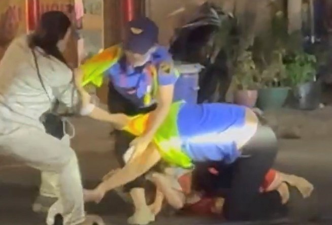Không dừng lại ở đó, sau khi đoàn tàu đi qua, người phụ nữ bất ngờ lao vào hành hung hai nữ nhân viên. Một người thân đứng gần đó cũng tham gia, nắm tóc chị Thúy kéo ngã xuống đường.