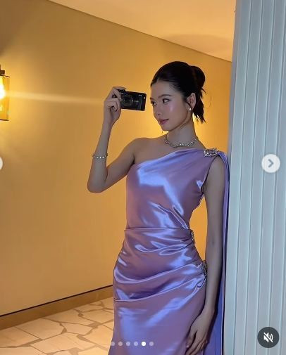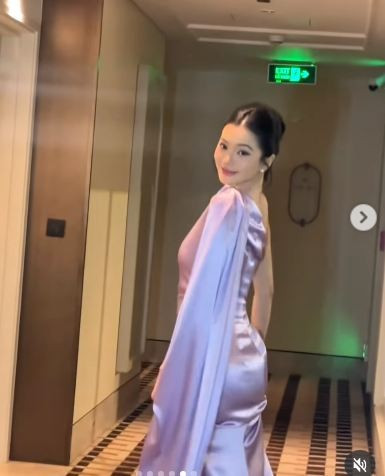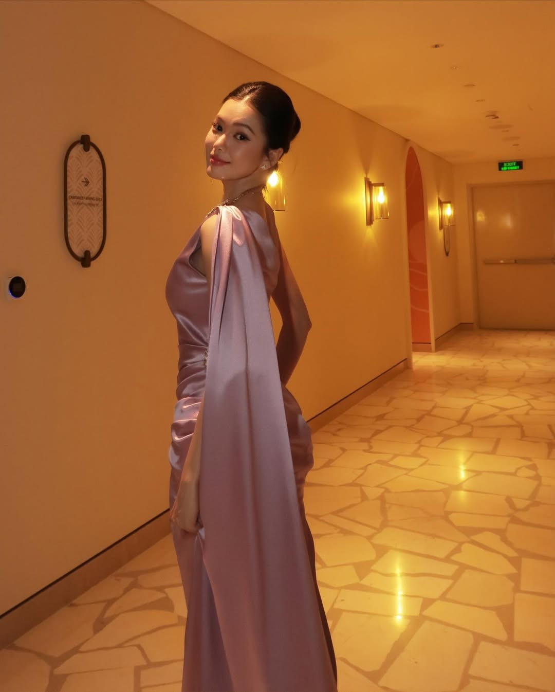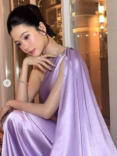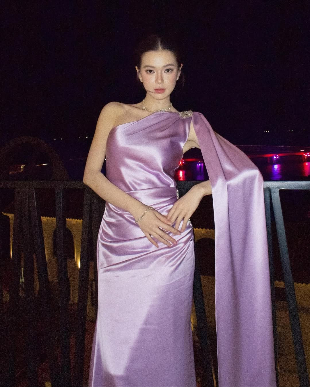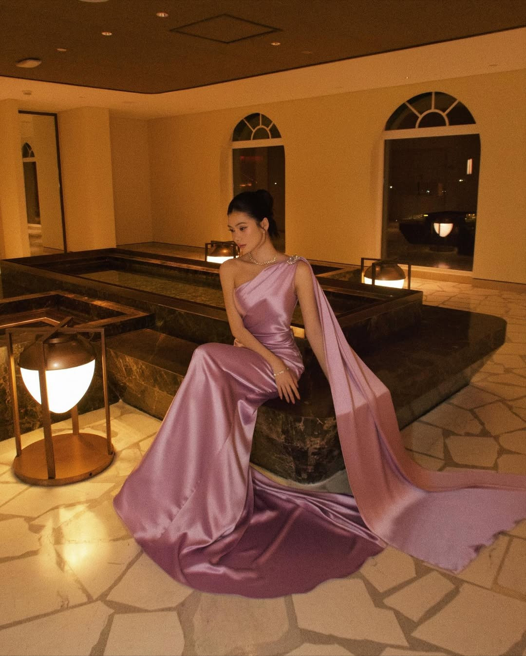 Lựa chọn trang phục lần này của Đỗ Yên Đan là chiếc đầm dạ hội dài, ôm sát cơ thể với chất liệu lụa satin bóng bẩy, màu tím lilac nhẹ nhàng nhưng cực kỳ sang trọng. (Ảnh: IGNV)