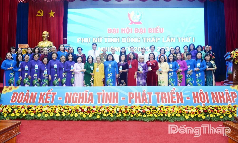 Bà Lê Thị Hiếu Tâm (hàng trên thứ 11 từ trái sang), chụp ảnh lưu niệm tại Đại hội đại biểu phụ nữ tỉnh Đồng Tháp lần thứ I.