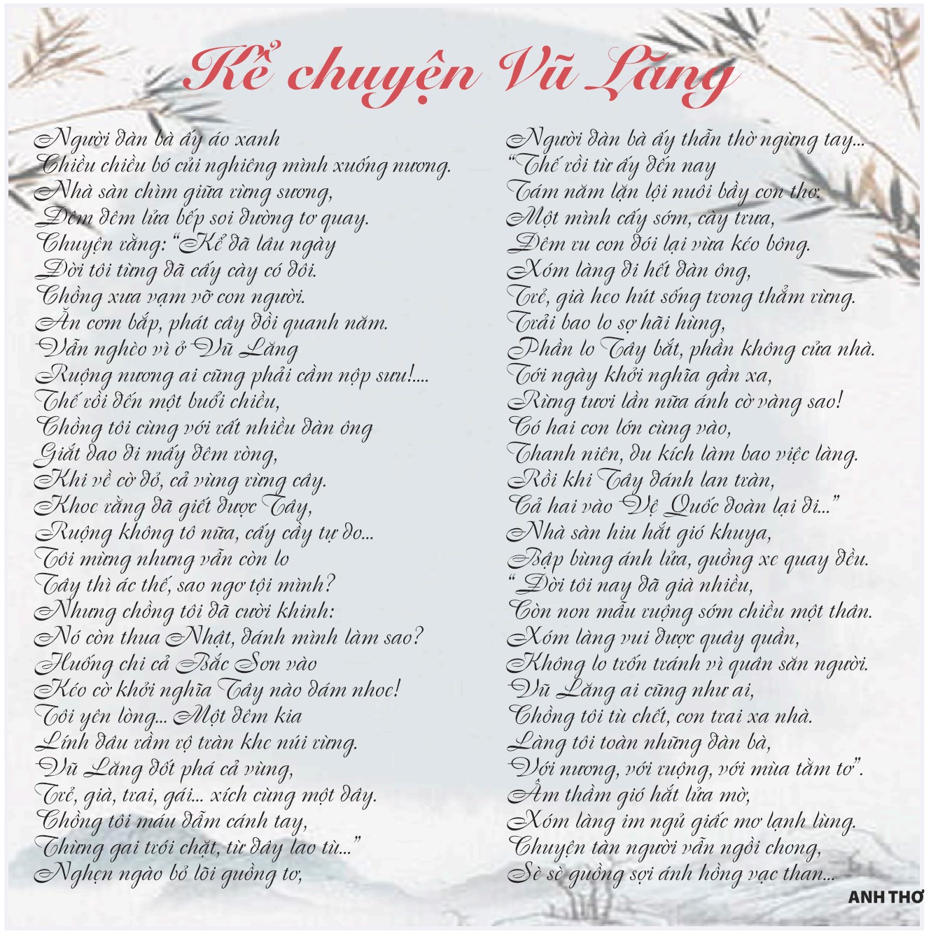 Trong ngôi nhà sàn “hiu hắt gió khuya” ở Vũ Lăng chỉ còn chị “Với nương, bắp, ruộng sớm chiều một thân”. Hàng ngày chị tích cực tham gia hoạt động đoàn thể nên được cử vào huyện bộ để cùng nữ sĩ Anh Thơ xây dựng phong trào phụ nữ của huyện. Cuộc sống tuy đơn côi, vất vả nhưng ấm áp, tràn đầy niềm vui tự do, độc lập. Những tháng ngày ‘ba cùng” (cùng làm, cùng ăn, cùng ở) vận động quần chúng chống xâm lăng, diệt giặc đói, trừ giặc dốt, Anh Thơ đã tiếp xúc với nhiều phụ nữ, được họ chia sẻ những câu chuyện về gia đình, làng xóm, quê hương... Bà đã vô cùng xúc động, cảm kích trước những hy sinh, mất mát của người dân nơi đây, đặc biệt là gia đình chị Lủ. Mặc dù nghèo khổ, neo đơn, chịu nhiều đau thương, mất mát nhưng chị vẫn hết lòng vì việc đoàn thể. Ngay từ khi mới gặp lần đầu, nữ sĩ Anh Thơ đã ấp ủ ý định viết về chị Lủ vì bà nghĩ gia cảnh của chị thế “chắc sẽ có nhiều tâm sự!”. Theo lời kể của bà, sau một thời gian đi công tác ở các xã trong huyện Bắc Sơn, một lần, nhớ chị Lủ bà tìm về Vũ Lăng thăm chị. Khi đến nơi vừa lúc sẩm tối, sau bữa cơm chiều, bên bếp lửa nhà sản, trong tiếng sè sè buồn tẻ của guồng quay sợi, Anh Thơ đã được nghe chị Lủ kể về cuộc đời mình: “Xưa kia cảnh nhà chị rất vui. Chồng chị làm khỏe, ăn cơm bắp rất nhiều. Hai con tuy trần người, không có quần áo nhưng rất đẹp và khỏe. Chỉ phải tội nghèo, vì làm ra bao nhiêu cũng đóng thuế, nộp tô, nộp sưu hết. Thương vợ con đói rách, chồng chị theo người ta đi đánh Tây. Được vài trận vui lắm. Anh em đồng chí cươi nói đầy nhà. Nhưng rồi quân nó có súng nhiều, đến bao vây Vũ Lăng, chồng chị và du kích bị chúng bắt trói, mang đi đâu đến bây giờ cả làng và chị cũng không biết. Nhưng ngay đêm đó, chị sợ chúng bắt nốt hai con. Phải đứa dắt tay, đứa địu trên lưng chạy vào hang núi. Rồi hái lá, đào củ ăn sống qua ngày. Cách mạng về, chị được chia ruộng, hai con đã lớn, cùng xin đi Vệ Quốc đoàn để trả thù cho bố. Bây giờ không ai phải nộp tô, nộp sưu nữa. Chị sống một mình, vui với ruộng rẫy, vui với chị em. Hầu hết là những vợ góa của du kích Bắc Sơn. Làng bây giờ còn toàn đàn bà, như chị thấy đó...”. Xúc động trước câu chuyện của chị Lủ, về ngôi làng “toàn những đàn bà”, ngay trong đêm đó, bên ánh lửa nhà sàn, nữ sĩ Anh Thơ đã viết xong truyện thơ “Kể chuyện Vũ Lăng”. Bài thơ kể về số phận một gia đình nhưng chứa đựng không gian rộng lớn của lịch sử cách mạng Bắc Sơn trải dài từ khi cuộc khởi nghĩa nổ ra năm 1940 cho đến những năm đầu của cuộc kháng chiến chống Pháp (1948).
