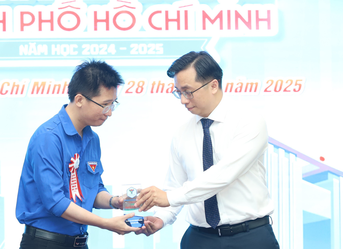 Anh Nguyễn Đức Nguyên - Phó Chủ tịch Trung ương Hội Sinh viên Việt Nam cùng anh Nguyễn Đăng Khoa - Phó Bí thư Thành Đoàn, Chủ tịch Hội Sinh viên Việt Nam TPHCM tặng Bằng khen của Thành Đoàn cho các bạn học sinh tiêu biểu.