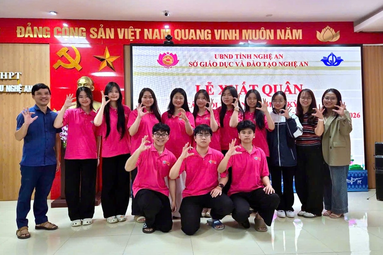 Mai Trúc cùng các thành viên đội tuyển Địa lí, Trường THPT chuyên Phan Bội Châu trong lễ xuất quân tham dự kỳ thi chọn học sinh giỏi quốc gia năm học 2025 - 2026. Ảnh: Nhân vật cung cấp
