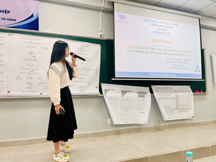 Sinh viên Kiều My trong buổi bảo vệ Đồ án tốt nghiệp của Bộ môn Cơ khí máy, Khoa Cơ khí.Ảnh: NVCC