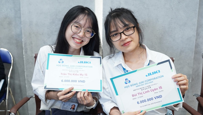 Kiều My (bên trái) và bạn nhận học bổng do Công ty TNHH JUKI Việt Nam trao tặng. Ảnh: NVCC