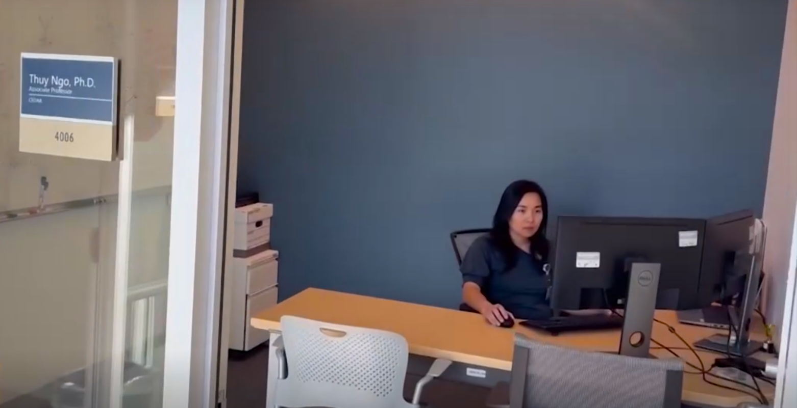 PGS.TS Ngô Thị Minh Thùy tại phòng làm việc ở Viện Nghiên cứu ung thư Knight của Đại học Y khoa và Khoa học Oregon, Mỹ. Ảnh cắt từ clip của VTV.