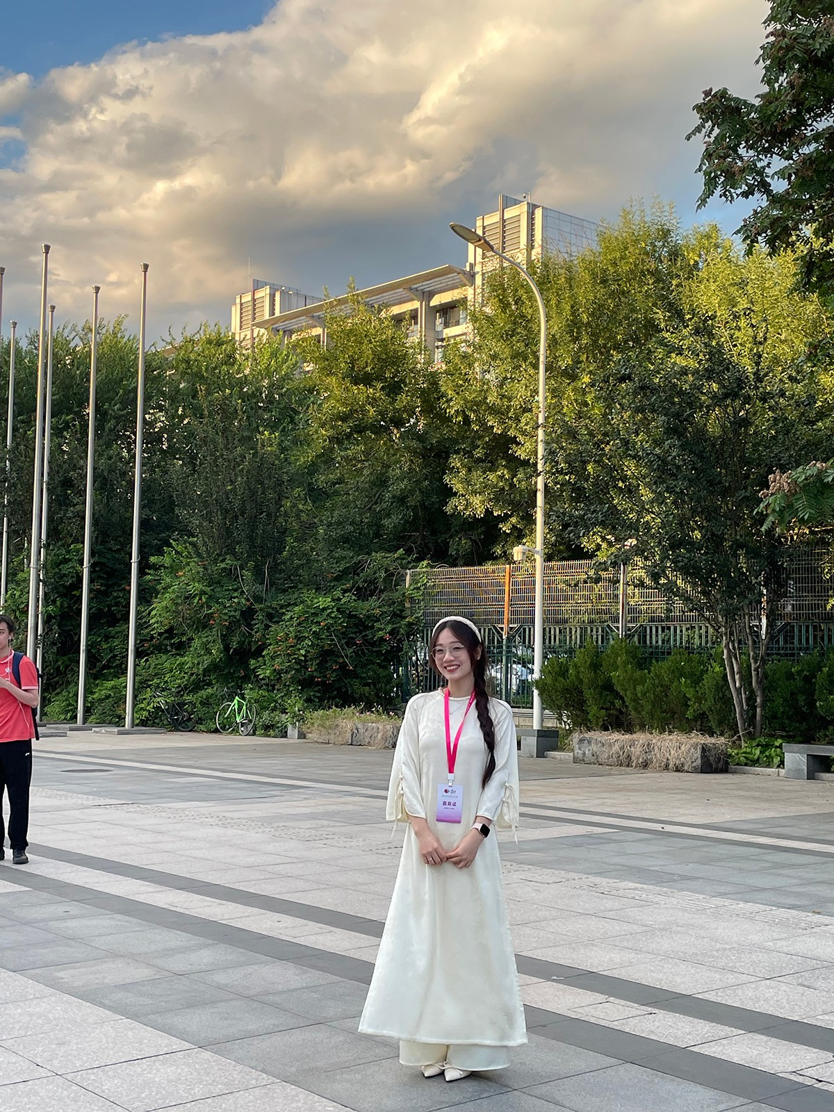Yến Nhi duyên dáng trong tà áo dài Việt Nam tại Trung Quốc, biểu tượng của sự hội nhập và bản sắc.