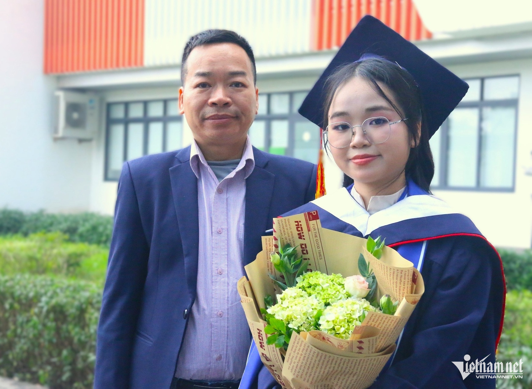 Nữ sinh Phùng Phương Uyên bên bố của mình trong ngày nhận bằng tốt nghiệp. Ảnh: Thanh Hùng.