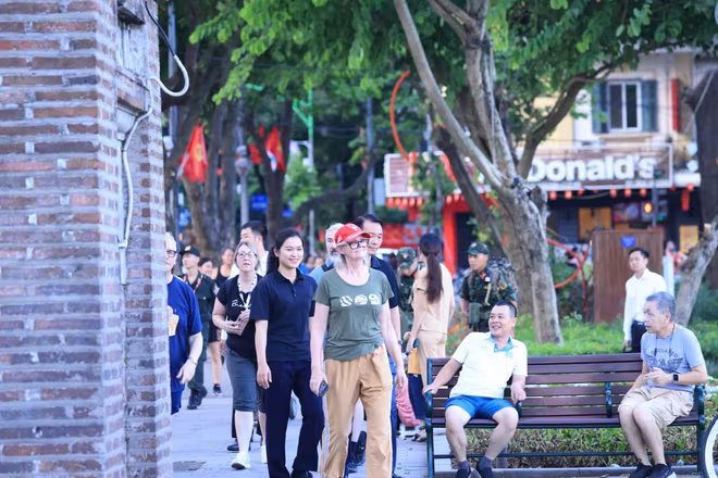 Đại úy Nguyễn Thu Hương (áo sẫm màu) bảo vệ tiếp cận Toàn quyền Australia đi dạo hồ Gươm lúc sáng sớm