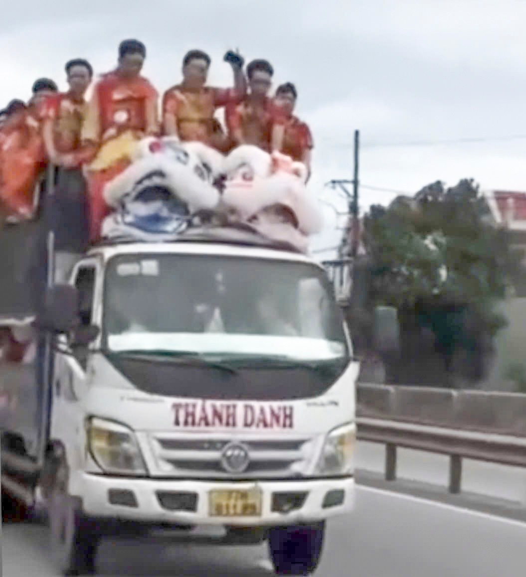 Hình ảnh đoàn múa lân ngồi trên nóc xe tải. Ảnh cắt từ clip