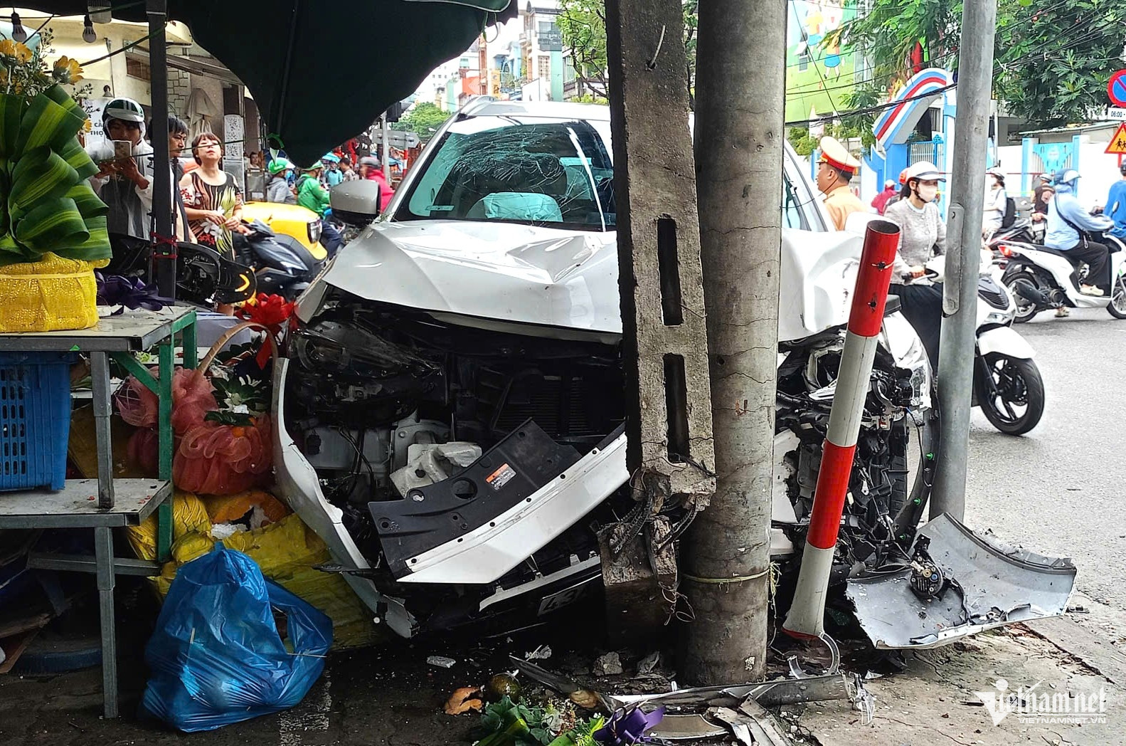 Chưa dừng lại, chiếc ô tô tiếp tục lao lên lề, tông vào khu vực sạp bán trái cây bên đường và chỉ dừng lại khi va vào trụ điện.