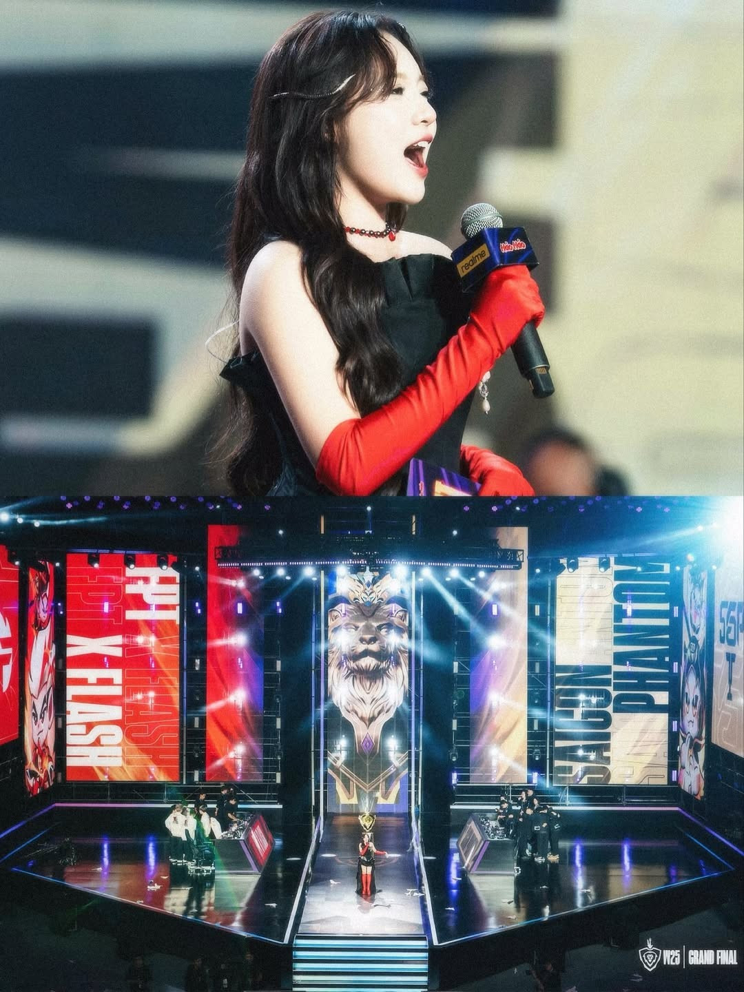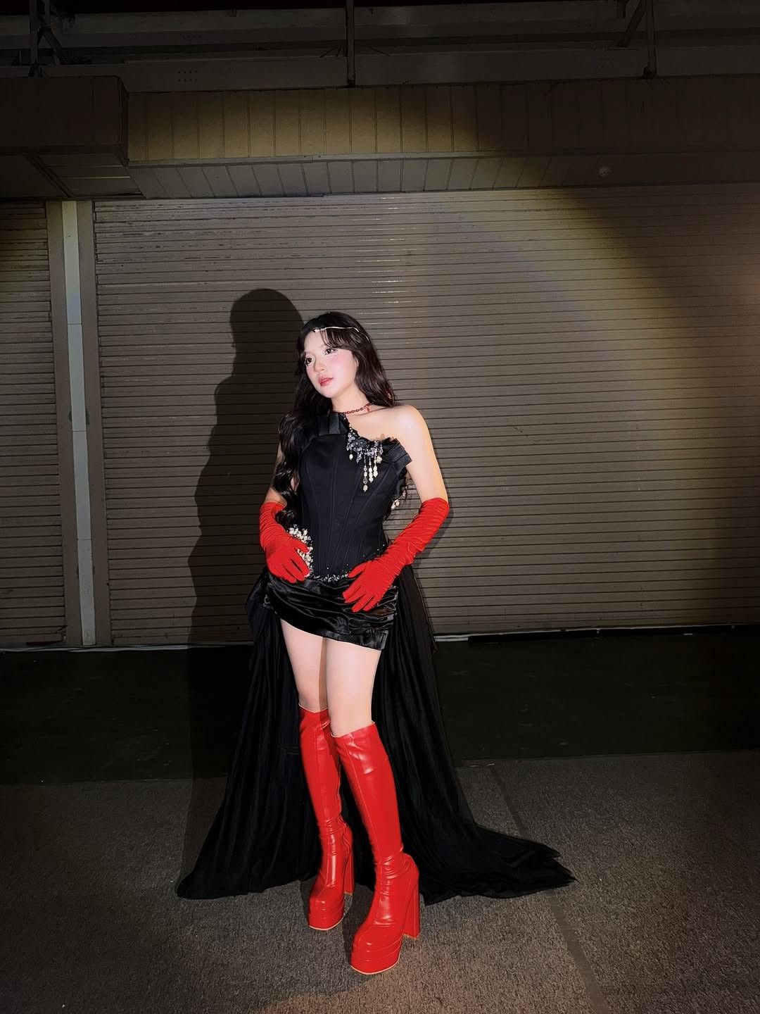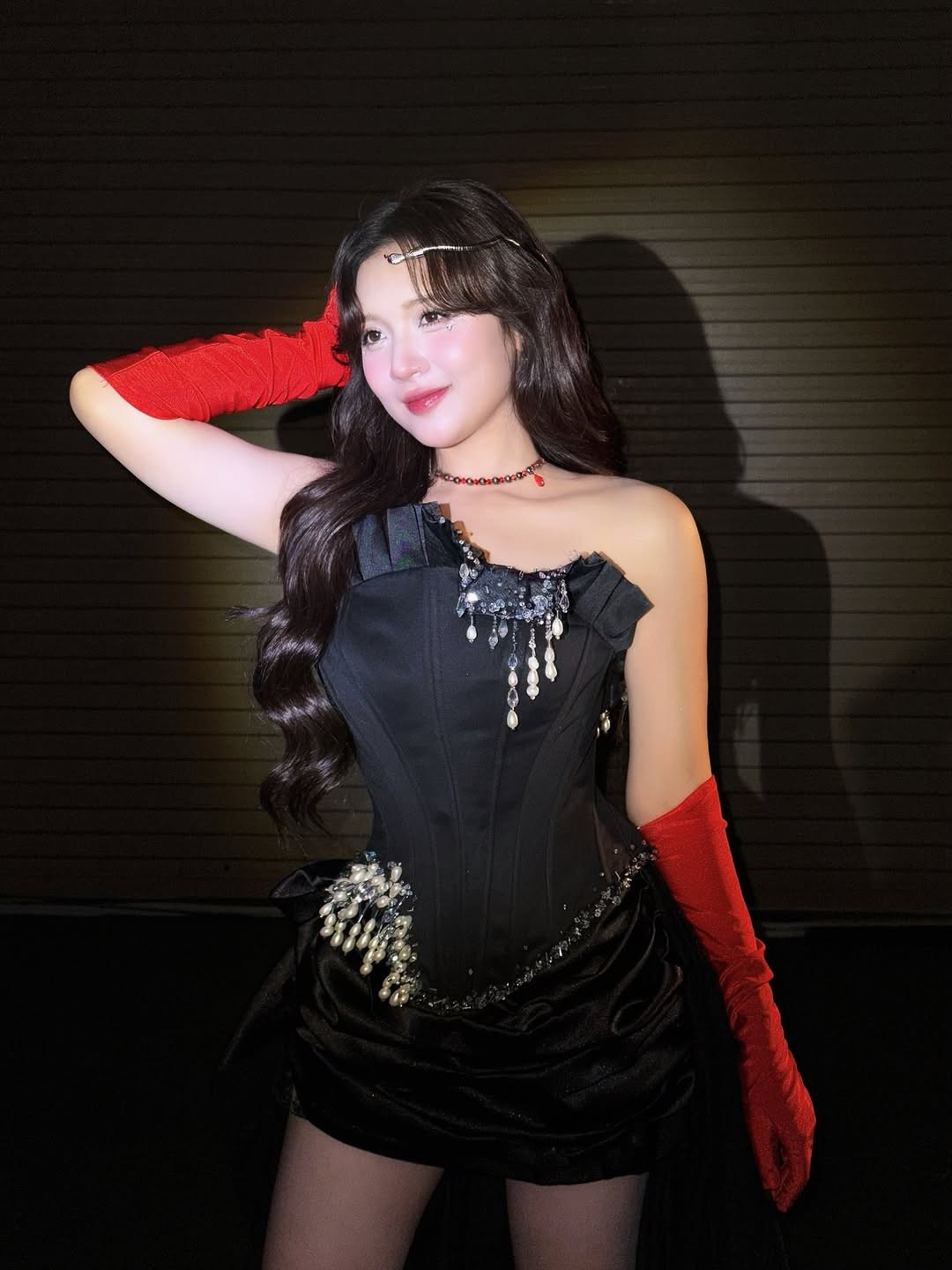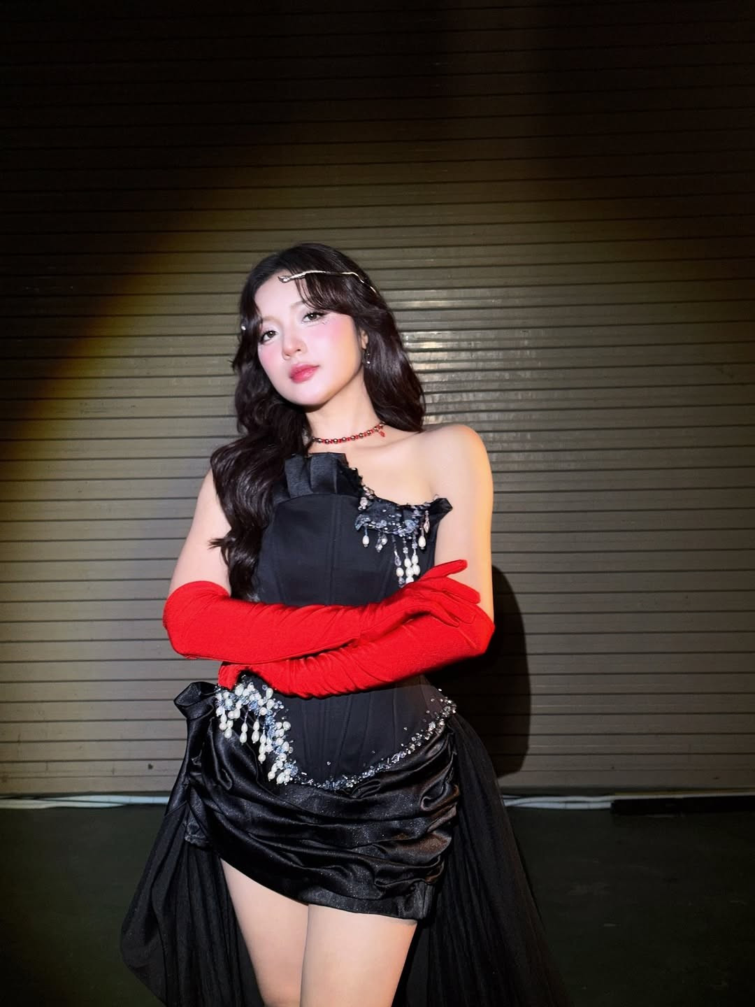Cô nàng "Nữ thần Liên Quân" đã khuấy đảo sân khấu Cung Điền kinh Mỹ Đình (Hà Nội) với màn tái xuất rực rỡ và phong cách thời trang cực kỳ ấn tượng, mang đậm chất "kiếp đỏ đen" đầy quyến rũ. (Ảnh: IGNV)
