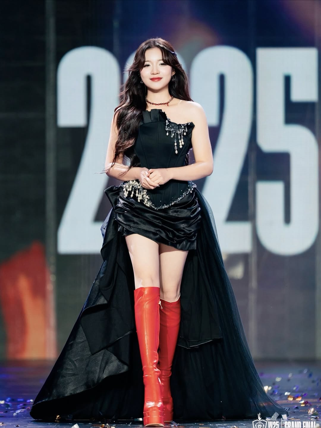 Trong đêm Chung kết ĐTDV Mùa Đông 2025, Phương Thảo chọn cho mình một bộ trang phục với tông màu chủ đạo là đen và đỏ, tạo nên một tổng thể đầy bí ẩn, sang trọng nhưng không kém phần nóng bỏng. (Ảnh: IGNV)