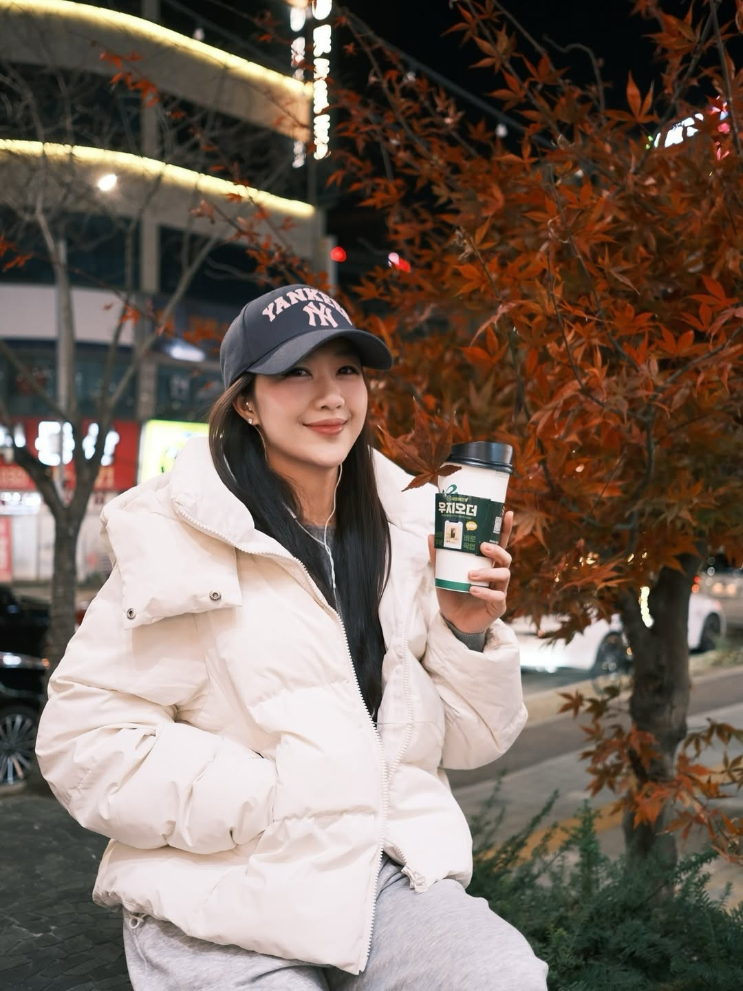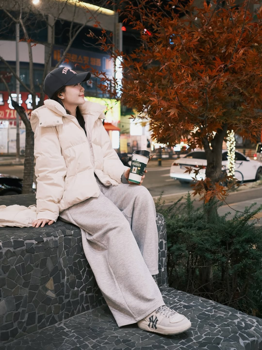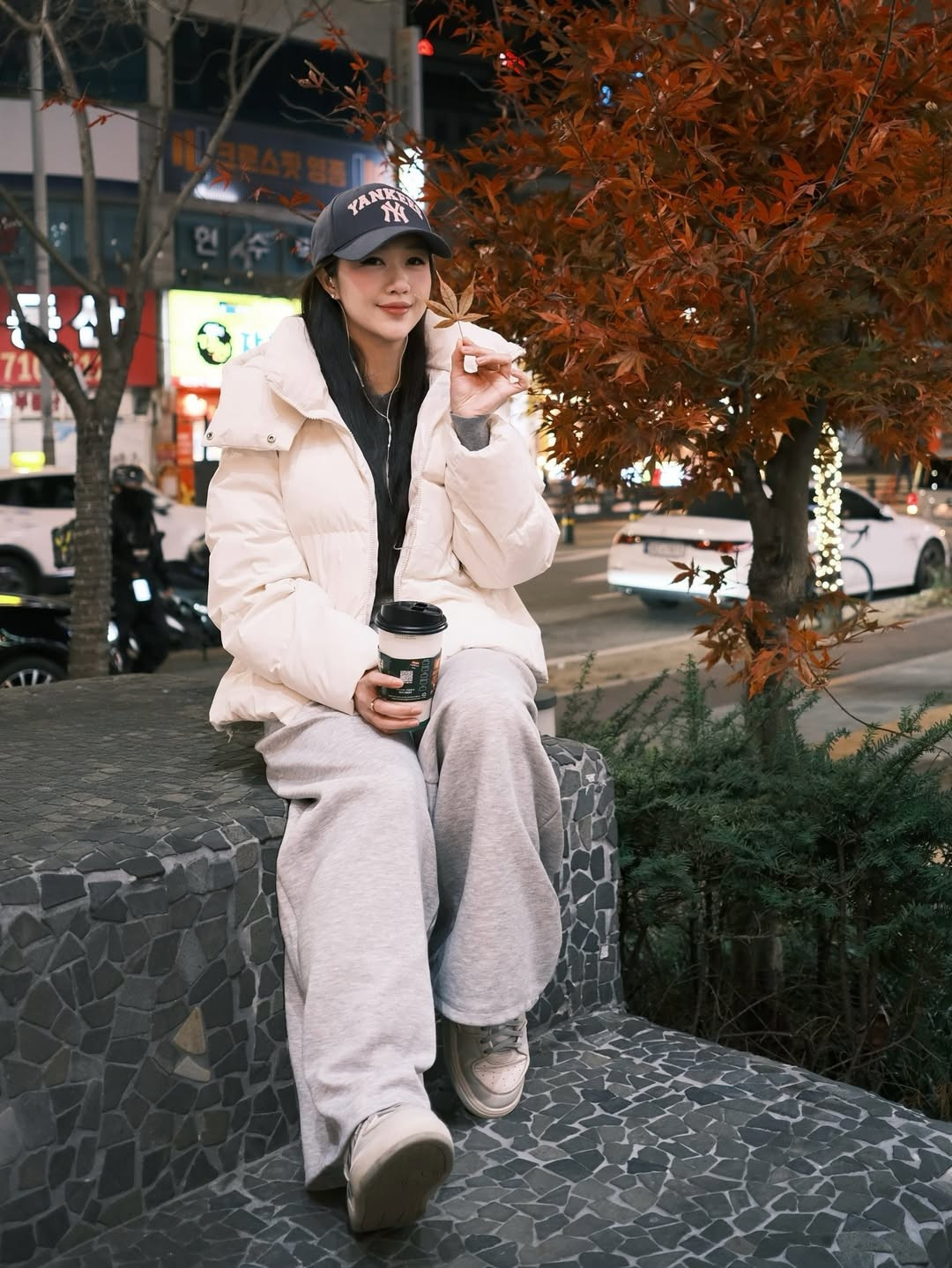 Ngồi bên khóm lá phong đỏ rực, Nam Phương cầm trên tay một ly đồ uống nóng – hình ảnh mang đúng “vibe” mùa lạnh: giản dị, đời thường nhưng đẹp đến hút mắt. Sự kết hợp giữa sắc đỏ của cây lá chuyển mùa và tông trang phục sáng màu giúp tổng thể bức ảnh vừa lãng mạn, vừa nổi bật.