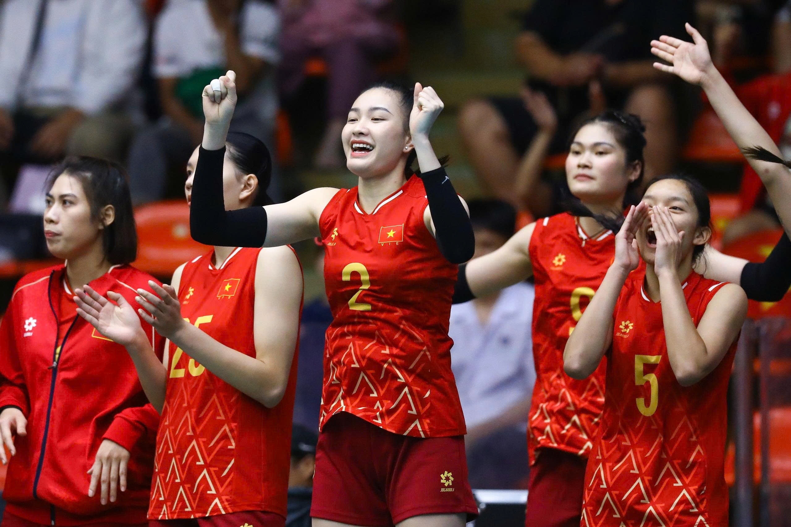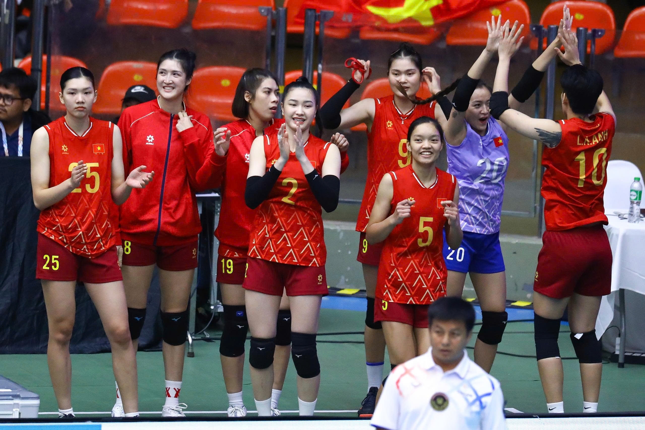 Kim Thanh ăn mừng trước cú đập ghi điểm của đồng đội trong trận đấu hôm 12/12. Hình ảnh của VĐV sinh năm 1999 từng nhiều lần được chia sẻ trên các hội nhóm yêu thích bóng chuyền châu Á. "Hoa khôi bóng chuyền" Việt Nam thường xuyên được khen ngợi về ngoại hình. The Thaiger từng khen Kim Thanh "xinh đẹp như minh tinh" hay "ngoại hình không thua kém các diễn viên, người mẫu". Ảnh: Minh Chiến.