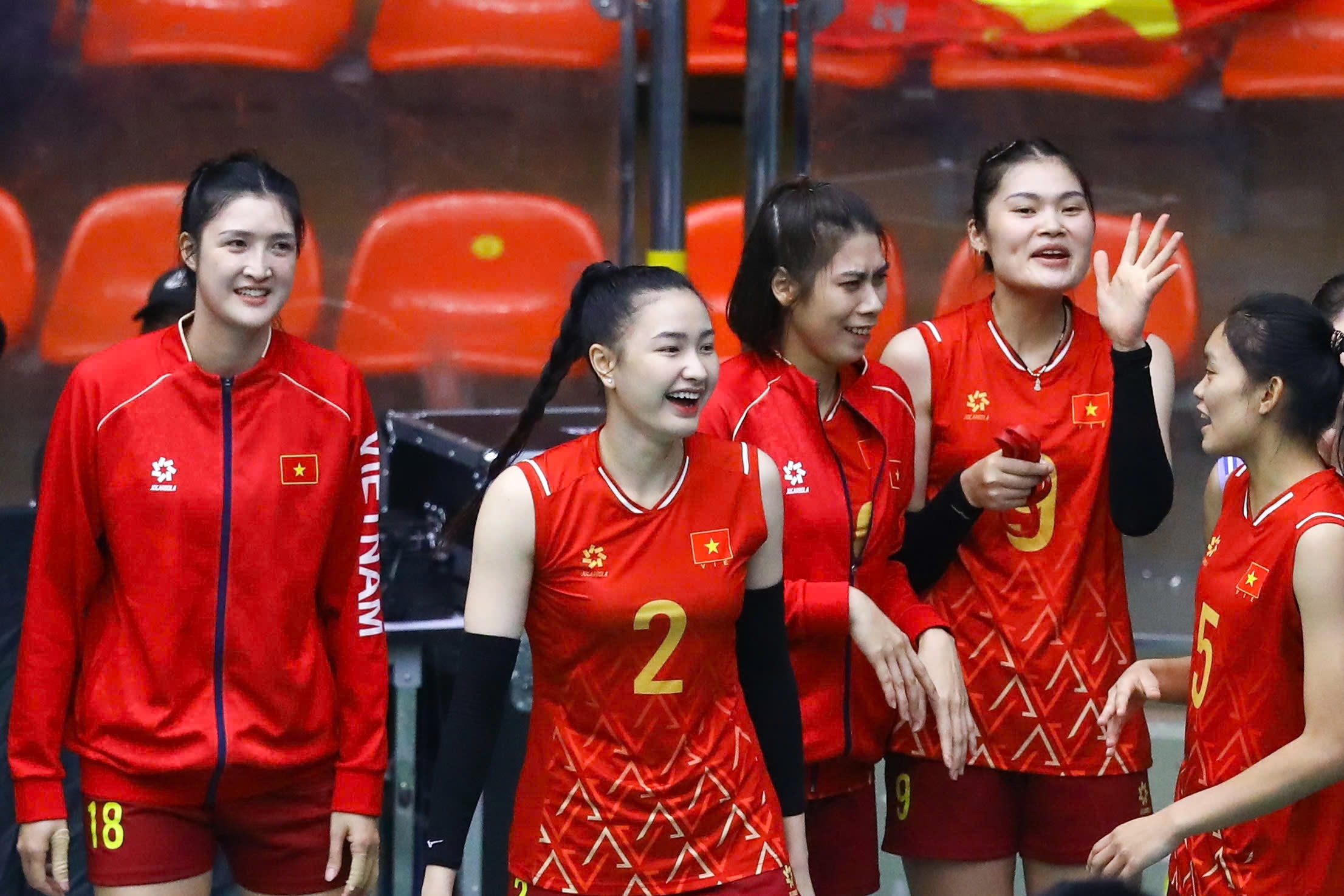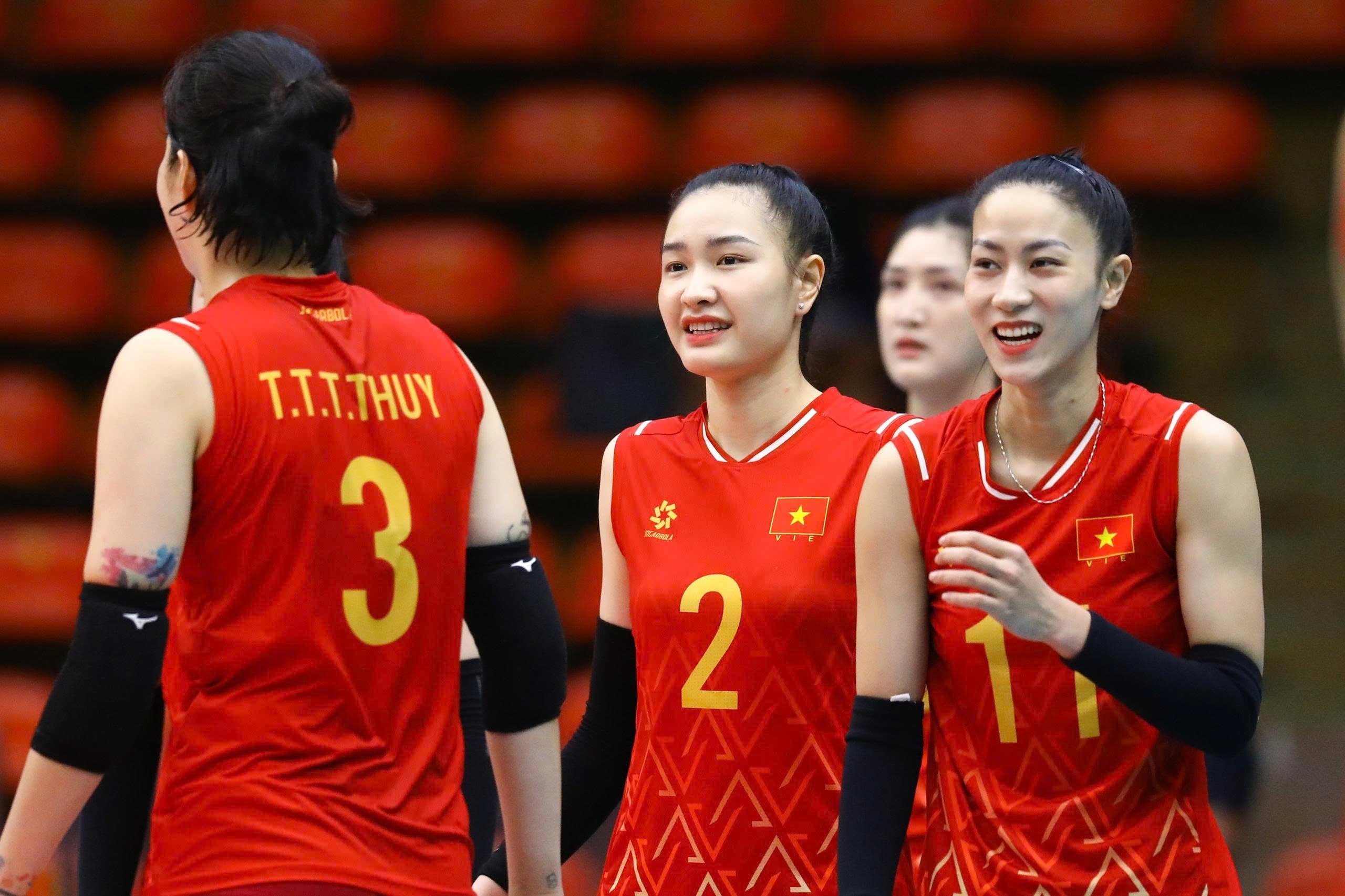 Sau 3 trận toàn thắng, tuyển bóng chuyền nữ Việt Nam giành quyền vào bán kết với thành tích nhất bảng B, sẽ gặp Philippines ở vòng sau, diễn ra ngày 14/12. Ảnh: Minh Chiến.