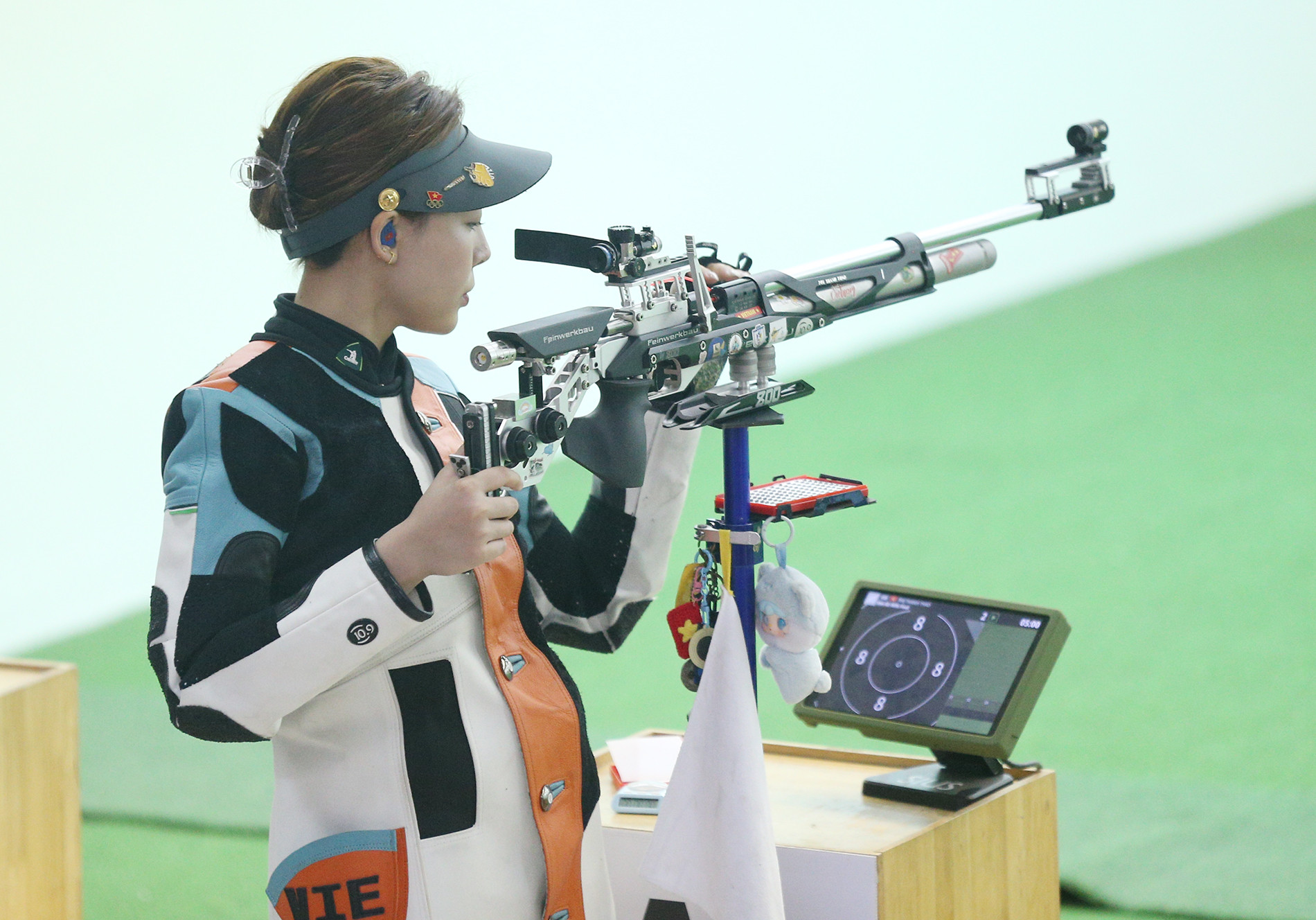 Trưa 13/12, hai xạ thủ Phí Thanh Thảo và Lê Thị Mộng Tuyền tranh tài ở nội dung 10 m súng trường hơi cá nhân nữ.