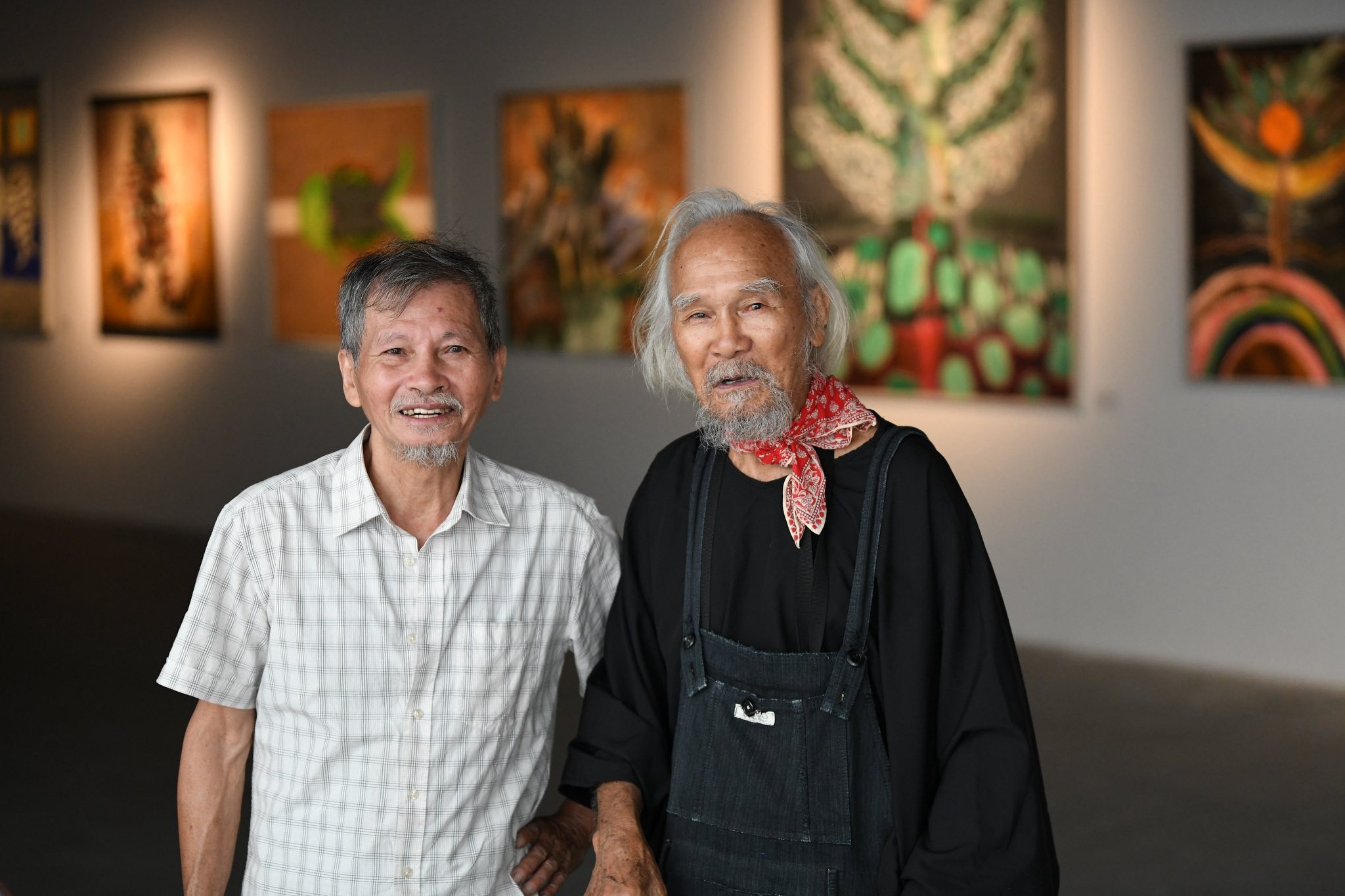 Họa sĩ Lý Trực Sơn và Ca Lê Thắng tại triển lãm.