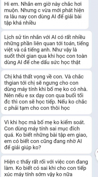 Vài ngày qua, trên mạng xã hội lan truyền tin nhắn của một phụ huynh nhắn cho gia sư của con mình với nội dung: “Chị vừa mới phát hiện ra lâu nay con dùng Al để giải bài tập khá nhiều. Lịch sử tin nhắn với AI có rất nhiều những phần liên quan tới toán, tiếng Việt và cả tiếng Anh. Như vậy là suốt thời gian qua khi học con toàn dùng Al để che giấu sức học thật. Chị khá thất vọng về con và chắc thời gian tới chị sẽ ngưng cho con dùng máy tính khi bố mẹ không có nhà. Nên nếu em sắp xếp dạy con qua buổi tối được thì con sẽ học tiếp, nếu không chắc chị phải tạm cho con thôi học vì khi học mà bố mẹ không kiểm soát. Con dùng máy tính sai mục đích quá, không biết những bài tập em giao, em có biết con cũng đang nhờ AI để giải giúp không…”.