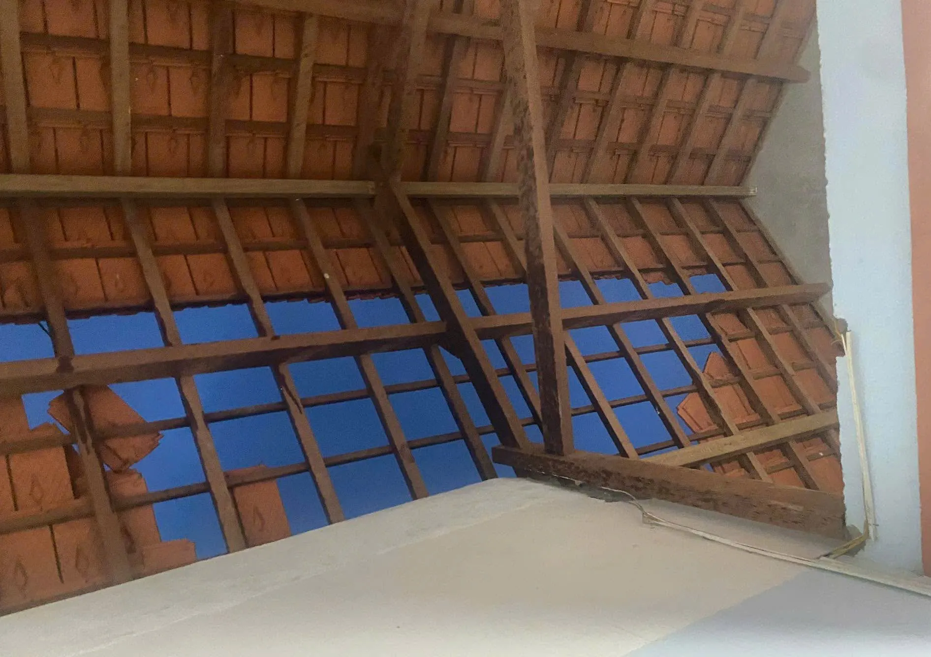 Ngôi nhà của một người dân bị lốc cuốn bay phần ngói trên mái.