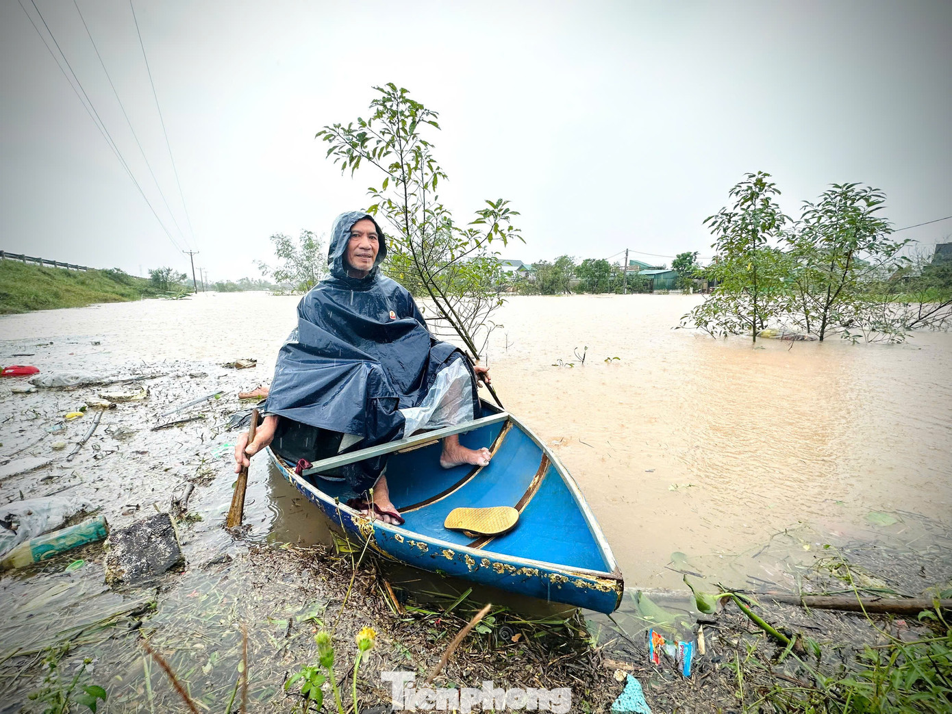 Một người đàn ông xã Cẩm Duệ dùng thuyền nhỏ để chở cháu gái đến vị trí cao hơn để chạy lũ.