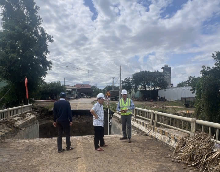 Lãnh đạo Khu Quản lý đường bộ III (Cục Đường bộ Việt Nam), kiểm tra hiện trường để chỉ đạo khắc phục cầu Đắk Pờ Tó.