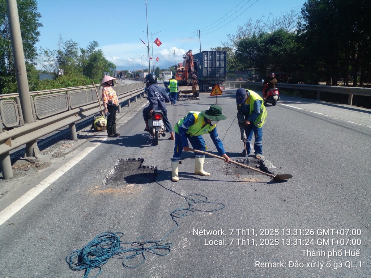 Thông tin mới nhất, chiều nay (13h18 ngày 07/11/2025) Khu QLĐB II đã chỉ đạo TP Huế Công ty CP Quản lý và xây dựng Đường bộ Thừ Thiên Huế tranh thủ thời tiết nắng ráo đang tiến hành sửa chữa và ổ gà bằng bê tông nhựa nóng trên tuyến QL1 và tuyến tránh TP Huế qua địa bàn TP Huế gồm có 4 mũi thi công.