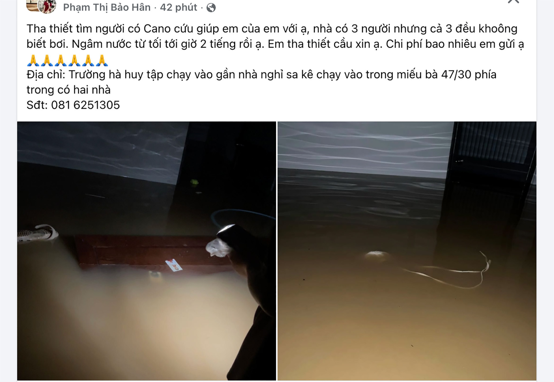 Còn tài khoản Vân Uyên cũng đăng tải nội dung cầu cứu trong các hội nhóm mạng xã hội ở Nha Trang. Nội dung chủ tài khoản cầu cứu: “Nhà ba mẹ em nước cao, lên mái nhà hết rồi mọi người ơi, em gọi cứu hộ không được, mong được mọi người giúp đỡ tại địa chỉ số 55 Cầu Bè, Vĩnh Thạnh (Bên cạnh quán Bida). Cứu gia đình em với 0335163724/0982582581/0347922498.”